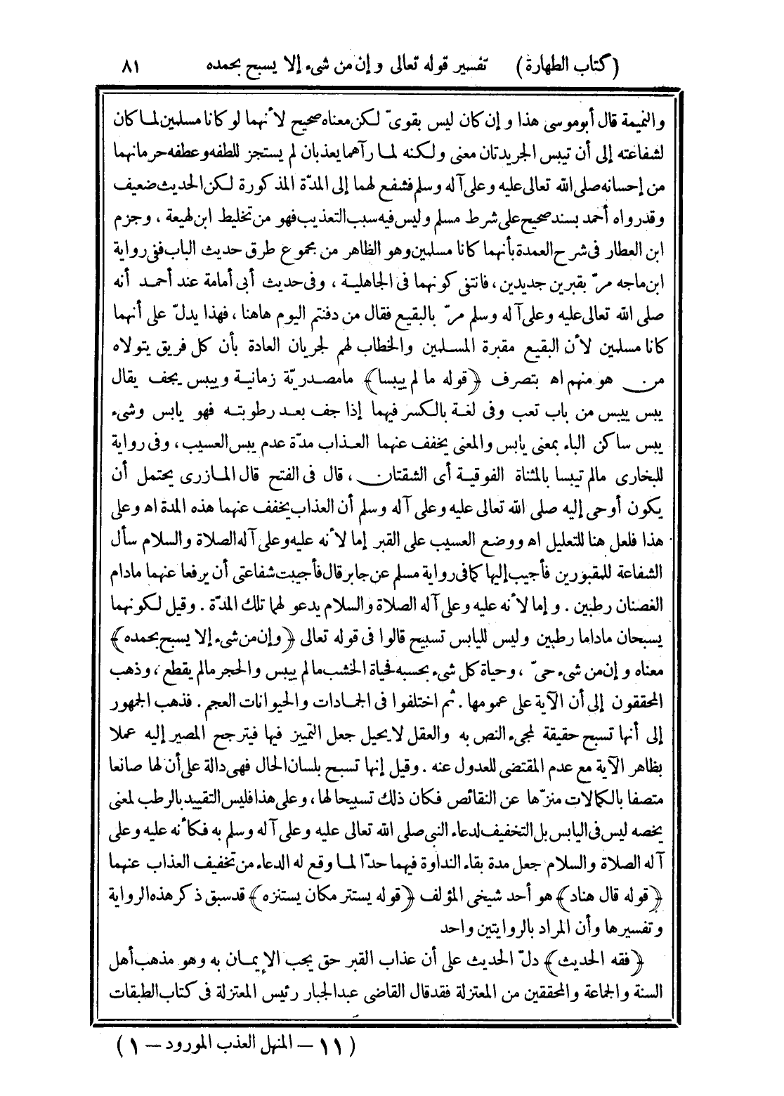 والنميمة قال أبو موسى هذا وإن كان ليس بقويّ لكن معناه صحيح لأنهما لو كانا مسلمين لما كان لشفاعته إلى أن تيبس الجريدتان معنى ولكنه لما رآهما يعذبان لم يستجز للطفه وعطفه حرمانهما من إحسانه صلى الله تعالى عليه وعلى آله وسلم فشفع لهما إلى المدّة المذكورة لكن الحديث ضعيف وقد رواه أحمد بسند صحيح على شرط مسلم وليس فيه سبب التعذيب فهو من تخليط ابن لهيعة، وجزم ابن العطار في شرح العمدة بأنهما كانا مسلمين وهو الظاهر من مجموع طرق حديث الباب ففى رواية ابن ماجه مرّ بقبرين جديدين، فانتفى كونهما في الجاهلية، وفى حديث أبى أمامة عند أحمد أنه صلى الله تعالى عليه وعلى آله وسلم مرّ بالبقيع فقال من دفنتم اليوم ها هنا، فهذا يدل على أنهما كانا مسلمين لأن البقيع مقبرة المسلمين والخطاب لهم لجريان العادة بأن كل فريق يتولاه من هو منهم اهـ بتصرف