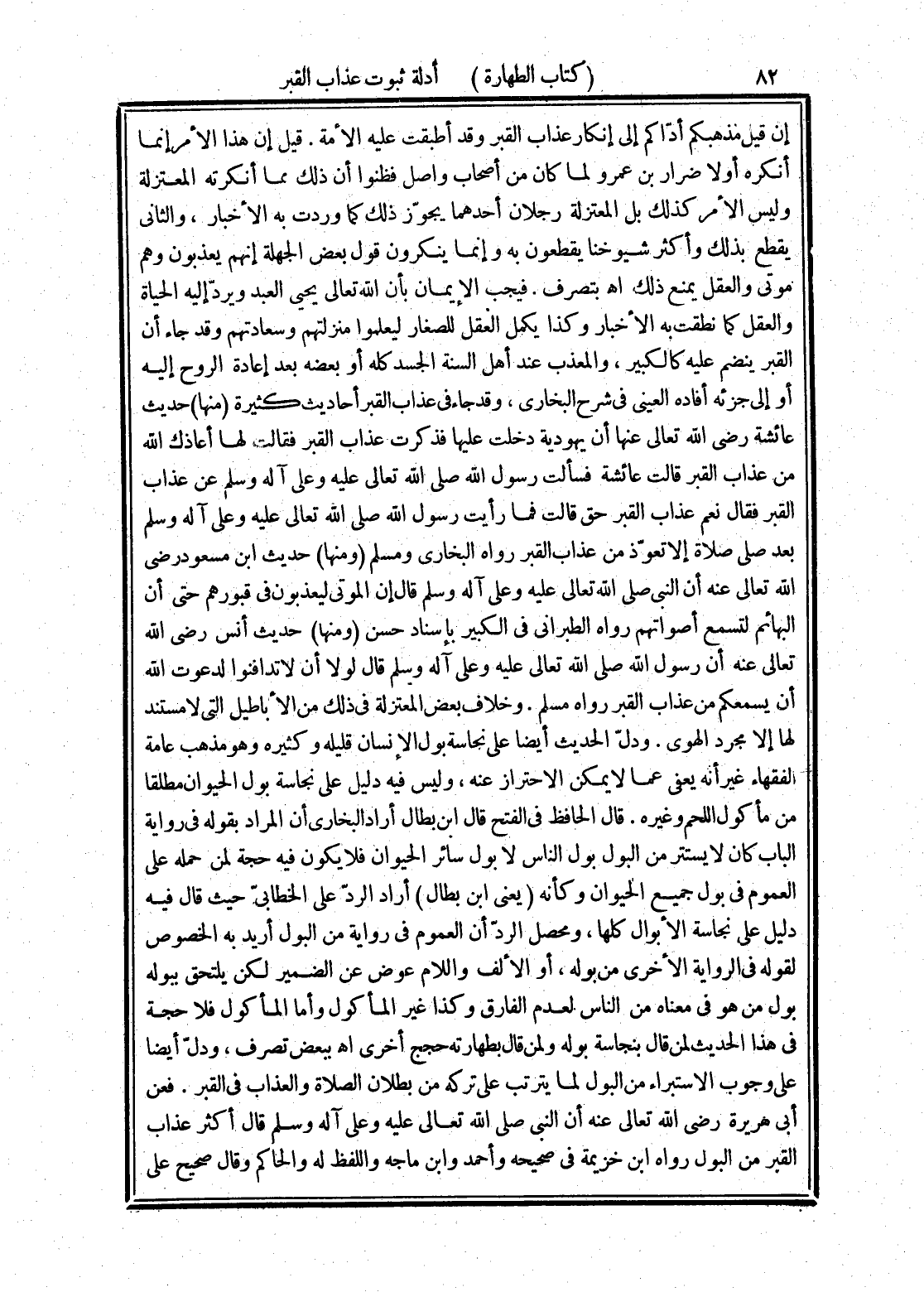 إن قيل مذهبكم أدّاكم إلى إنكار عذاب القبر وقد أطبقت عليه الأمة. قيل إن هذا الأمر إنما أنكره أولا ضرار بن عمرو لما كان من أصحاب واصل فظنوا أن ذلك مما أنكرته المعتزلة وليس الأمر كذلك بل المعتزلة رجلان أحدهما يجوّز ذللك كما وردت به الأخبار، والثانى يقطع بذلك وأكثر شيوخنا يقطعون به وإنما ينكرون قول بعض الجهلة إنهم يعذبون وهم موتى. والعقل يمنع ذلك اهـ بتصرف. فيجب الإيمان بأن الله تعالى يحيى العبد ويردّ إليه الحياة والعقل كما نطقت به الأخبار وكذا يكمل العقل للصغار ليعلموا منزلتهم وسعادتهم وقد جاء أن القبر ينضم عليه كالكبير، والمعذب عند أهل السنة الجسد كله أو بعضه بعد إعادة الروح إلي إليه أو إلى جزئه أفاده العينى في شرح البخارى، وقد جاء في عذاب القبر أحاديث كثيرة (منها) حديث عائشة رَضِيَ اللَّهُ تَعَالَى عَنْهُا أن يهودية دخلت عليها فذكرت عذاب القبر فقالت لها أعاذك الله من عذاب القبر قالت عائشة فسألت رسول الله صلى الله تعالى عليه وعلى آله وسلم عن عذاب القبر فقال نعم عذاب القبر حق قالت فما رأيت رسول الله صلى الله تعالى عليه وعلى آله وسلم بعد صلى صلاة إلا تعوّذ من عذاب القبر رواه البخارى ومسلم (ومنها) حديث ابن مسعود رَضِيَ اللَّهُ تَعَالَى عَنْهُ أن النبى صلى الله تعالى عليه وعلى آله وسلم قال إن الموتى ليعذبون في قبورهم حتى أن البهائم لتسمع أصواتهم رواه الطبرانى في الكبير بإسناد حسن (ومنها) حديث أنس رَضِيَ اللَّهُ تَعَالَى عَنْهُ أن رسول الله صلى الله تعالى عليه وعلى آله وسلم قال لولا أن لا تدافنوا لدعوت الله أن يسمعكم من عذاب القبر رواه مسلم. وخلاف بعض المعتزلة في ذلك من الأباطيل التى لا مستند لها إلا لمجرد الهوى. ودلّ الحديث أيضا على نجاسة بول الإنسان قليله وكثيره وهو مذهب عامة الفقهاء غير أنه يعفى عما لا يمكن الاحتراز عنه، وليس فيه دليل على نجاسة بول الحيوان مطلقا من مأكول اللحم وغيره. قال الحافظ في الفتح قال ابن بطال أراد البخارى أن المراد بقوله في رواية الباب كان لا يستتر من البول بول الناس لا بول سائر الحيوان فلا يكون فيه حجة لمن حمله على العموم في بول جميع الحيوان وكأنه (يعنى ابن بطال) أراد الردّ على الخطابىّ حيث قال فيه دليل على نجاسة الأبوال كلها، ومحصل الردّ أن العموم في رواية من البول أريد به الخصوص لقوله في الرواية الأخرى من بوله، أو الألف واللام عوض عن الضمير لكن يلتحق ببوله بول من هو في معناه من الناس لعدم الفارق وكذا غير المأكول وأما المأكول فلا حجة في هذا الحديث لمن قال بنجاسة بوله ولمن قال بطهارته حجج أخرى اهـ ببعض تصرف، ودلّ أيضا على وجوب الاستبراء من البول لما يترتب على تركه من بطلان الصلاة والعذاب في القبر. فعن أبى هريرة رَضِيَ اللَّهُ تَعَالَى عَنْهُ أن النبى صلى الله تعالى عليه وعلى آله وسلم قال أكثر عذاب القبر من البول رواه ابن خزيمة في صحيحه وأحمد وابن ماجه واللفظ له والحاكم وقال صحيح على