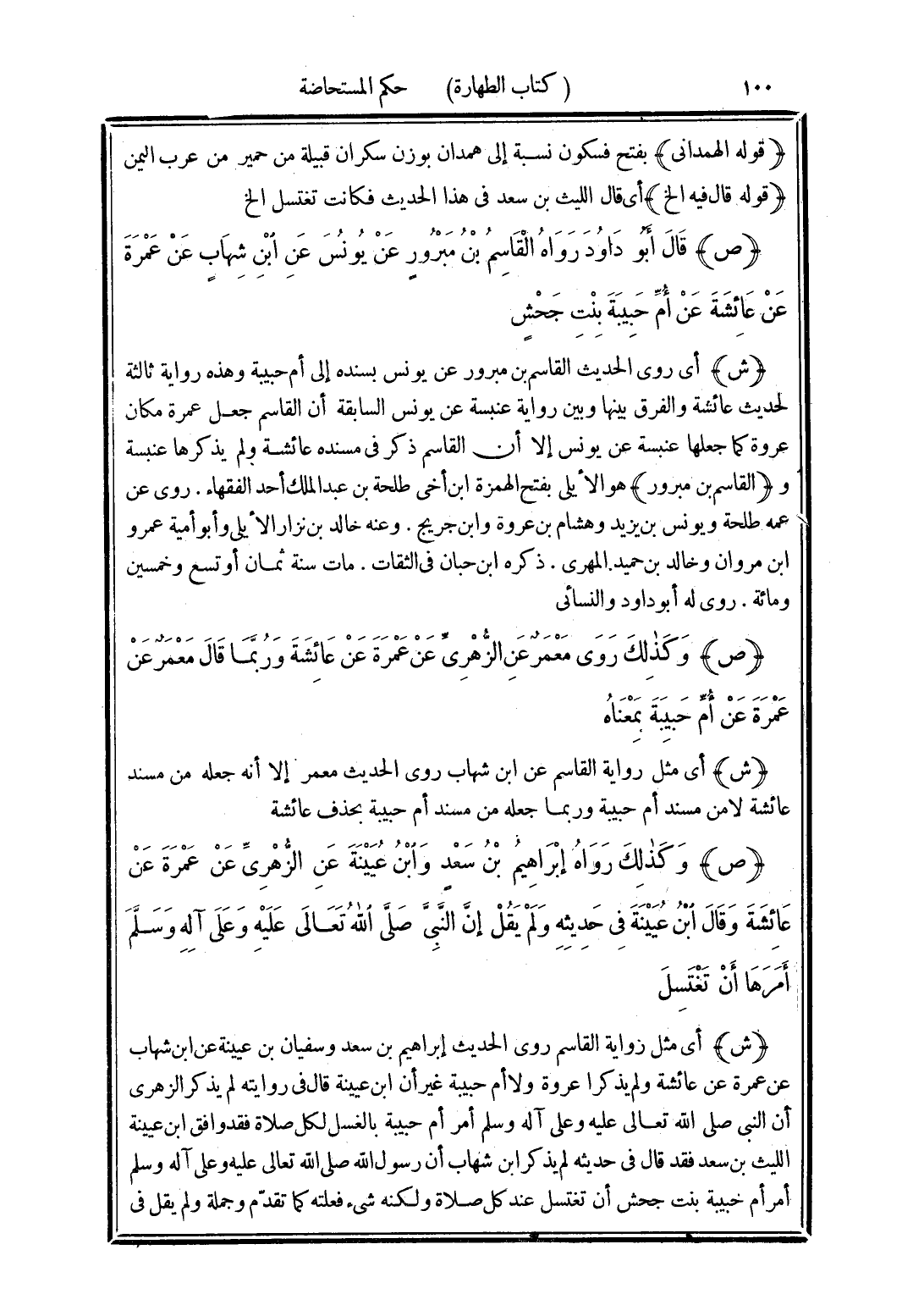 (ص) وَكَذَلِكَ رَوَاهُ إِبْرَاهِيمُ بْنُ سَعْدٍ، وَابْنُ عُيَيْنَةَ، عَنِ الزُّهْرِيِّ، عَنْ عَمْرَةَ، عَنْ عَائِشَةَ، وَقَال ابْنُ عُيَيْنَةَ فِي حَدِيثِهِ، وَلَمْ يَقُلْ إِنَّ النَّبِيَّ صَلَّى اللهُ تَعَالَى عَلَيْهِ وَعَلَى آلِهِ وسَلَّمَ أَمَرَهَا أَنْ تَغْتَسِلَ.