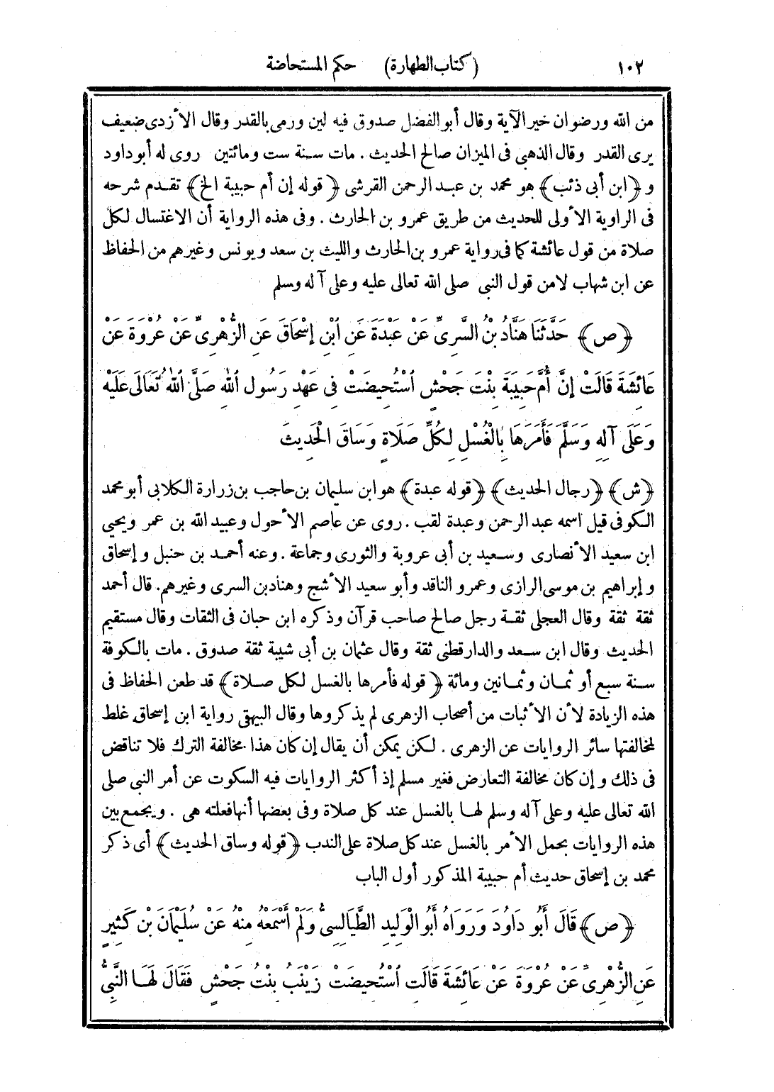 (ص) حَدَّثَنَا هَنَّادُ بْنُ السَّرِيِّ، عَنْ عَبْدَةَ، عَنِ ابْنِ إِسْحَاقَ، عَنِ الزُّهْرِيِّ، عَنْ عُرْوَةَ، عَنْ عَائِشَةَ، أَنَّ أُمَّ حَبِيبَةَ بِنْتَ جَحْشٍ اسْتُحِيضَتْ فِي عَهْدِ رَسُولِ اللَّهِ صَلَّى اللهُ تَعَالَى عَلَيْهِ وَسَلَّمَ «فَأَمَرَهَا بِالْغُسْلِ لِكُلِّ صَلَاةٍ»، وَسَاقَ الْحَدِيثَ.