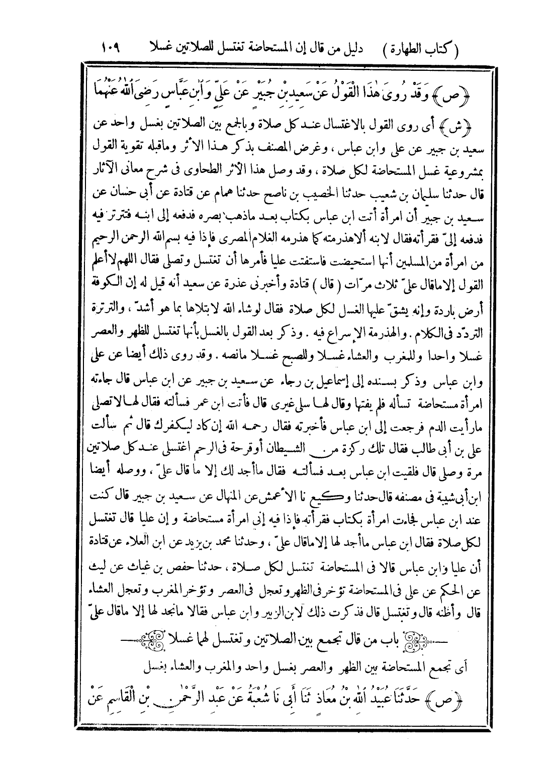 (ش) أى روى القول بالاغتسال عند كل صلاة وبالجمع بين الصلاتين بغسل واحد عن سعيد بن جبير عن على وابن عباس، وغرض المصنف بذكر هذا الأثر وما قبله تقوية القول بمشروعية غسل المستحاضة لكل صلاة، وقد وصل هذا الأثر الطحاوى في شرح معاني الآثار قال حدثنا سليمان بن شعيب حدثنا الخصيب بن ناصح حدثنا همام عن قتادة عن أبى حسان عن سعيد بن جبير أن امرأة أتت ابن عباس بكتاب بعد ما ذهب بصره فدفعه إلى ابنه فتترتر فيه فدفعه إلىّ فقرأته فقال لابنه ألا هذرمته كما هذرمه الغلام المصرى فإذا فيه بِسْمِ اللَّهِ الرَّحْمَنِ الرَّحِيمِ من امرأة من المسلمين أنها استحيضت فاستفتت عليا فأمرها أن تغتسل وتصلى فقال اللهم لا أعلم القول إلا ما قال على ثلاث مرّات (قال) قتادة وأخبرني عذرة عن سعيد أنه قيل له إن الكوفة أرض بارده وإنه يشقّ عليها الغسل لكل صلاة فقال لو شاء الله لابتلاها بما هو أشدّ، والترترة التردّد في الكلام. والهذرمة الإسراع فيه. وذكر بعد القول بالغسل بأنها تغتسل للظهر والعصر غسلا واحدا وللمغرب والعشاء غسلا وللصبح غسلا ما نصه. وقد روى ذلك أيضا عن على وابن عباس وذكر بسنده إلى إسماعيل بن رجاء عن سعيد بن جبير عن ابن عباس قال جاءته امرأة مستحاضة تسأله فلم يفتها وقال لها سلى غيرى قال فأتت ابن عمر فسألته فقال لها لا تصلى ما رأيت الدم فرجعت إلى ابن عباس فأخبرته فقال رحمه الله إن كاد ليكفرك قال ثم سألت على بن أبى طالب فقال تلك ركزة من الشيطان أو قرحة في الرحم اغتسلى عند كل صلاتين مرة وصلى قال فلقيت ابن عباس بعد فسألته فقال ما أجد لك إلا ما قال علىّ، ووصله أيضا ابن أبى شيبة في مصنفه قال حدثنا وكيع نا الأعمش عن المنهال عن سعيد بن جبير قال كنت عند ابن عباس فجاءت امرأة بكتاب فقرأته فإذا فيه إني امرأة مستحاضة وإن عليا قال تغتسل لكل صلاة فقال ابن عباس ما أجد لها إلا ما قال علىّ، وحدثنا محمد بن يزيد عن ابن العلاء عن قتادة أن عليا وابن عباس قالا في المستحاضة تغتسل لكل صلاة، حدثنا حفص بن غياث عن ليث عن الحكم عن على في المستحاضة تؤخر في الظهر وتعجل في العصر وتؤخر المغرب وتعجل العشاء قال وأظنه قال وتغتسل قال فذكرت ذلك لابن الزبير وابن عباس فقالا ما نجد لها إلا ما قال علىّ