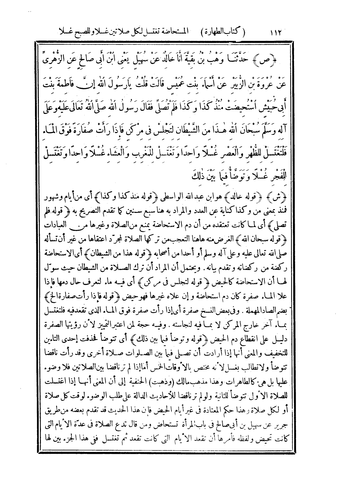 (ص) حَدَّثَنَا وَهْبُ بْنُ بَقِيَّةَ، أَنَا خَالِدٌ، عَنْ سُهَيْلٍ يَعْنِي ابْنَ أَبِي صَالِحٍ، عَنِ الزُّهْرِيِّ، عَنْ عُرْوَةَ بْنِ الزُّبَيْرِ، عَنْ أَسْمَاءَ بِنْتِ عُمَيْسٍ قَالَتْ: قُلْتُ: يَا رَسُولَ اللَّهِ، إِنَّ فَاطِمَةَ بِنْتَ أَبِي حُبَيْشٍ اسْتُحِيضَتْ - مُنْذُ كَذَا وَكَذَا - فَلَمْ تُصَلِّي فَقَالَ رَسُولُ اللَّهِ صَلَّى اللهُ تَعَالَى عَلَيْهِ وَسَلَّمَ: «سُبْحَانَ اللَّهِ، إِنَّ هَذَا مِنَ الشَّيْطَانِ لِتَجْلِسْ فِي مِرْكَنٍ، فَإِذَا رَأَتْ صُفَارَةً فَوْقَ الْمَاءِ فَلْتَغْتَسِلْ لِلظُّهْرِ وَالْعَصْرِ غُسْلًا وَاحِدًا، وَتَغْتَسِلْ لِلْمَغْرِبِ وَالْعِشَاءِ غُسْلًا وَاحِدًا، وَتَغْتَسِلْ لِلْفَجْرِ غُسْلًا وَتَتَوَضَّأْ فِيمَا بَيْنَ ذَلِكَ»