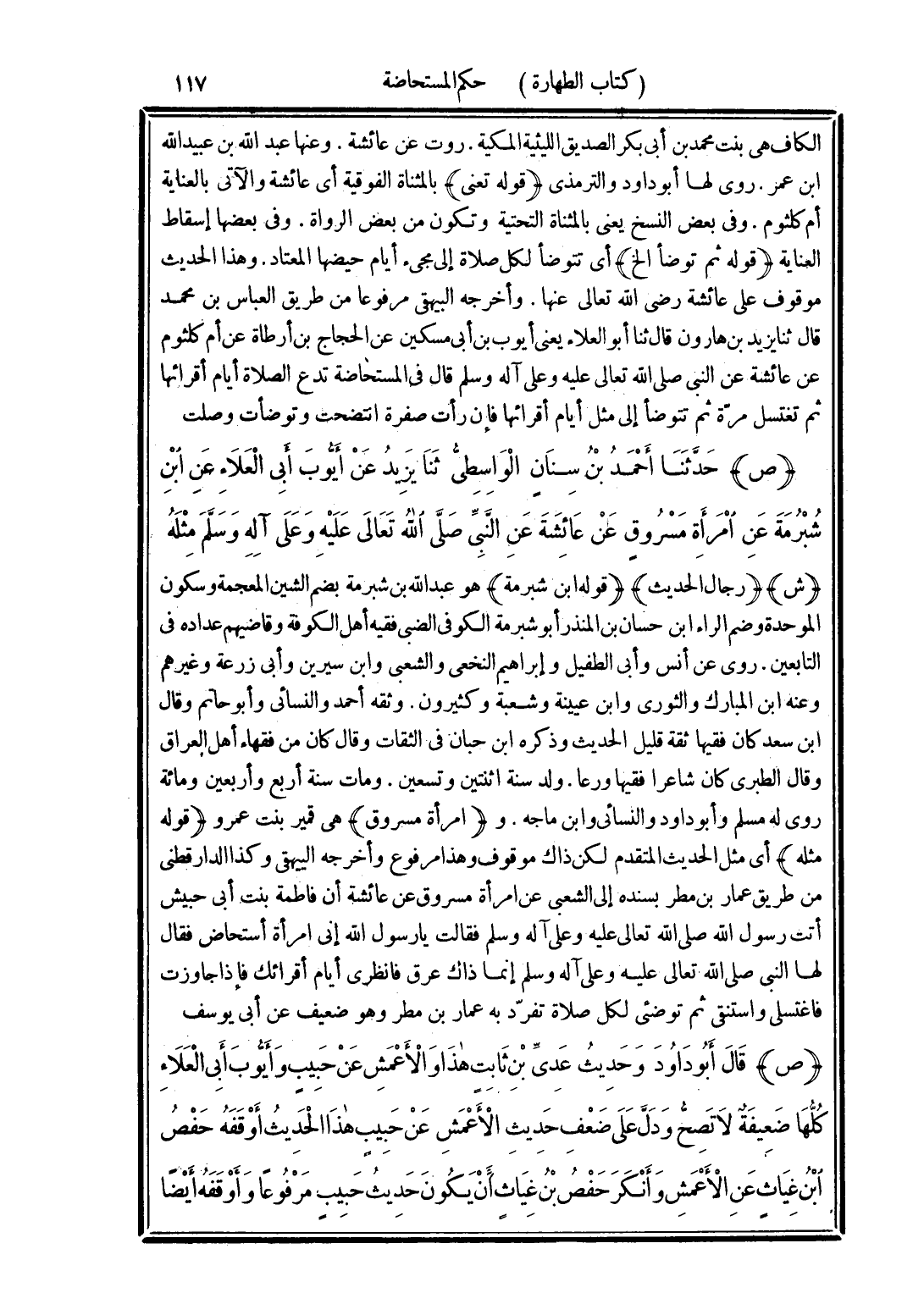 (قوله مثله) أى مثل الحديث المتقدم لكن ذاك موقوف وهذا مرفوع وأخرجه البيهقى وكذا الدارقطني من طريق عمار بن مطر بسنده إلى الشعبى عن امرأة مسروق عن عائشة أن فاطمة بنت، أبى حبيش أتت رسول الله صلى الله تعالى عليه وعلى آله وسلم فقالت يا رسول الله إني امرأة أستحاض فقال لها النبي صلى الله تعالى عليه وعلى آله وسلم إنما ذلك عرق فانظرى أيام أقرائك فإذا جاوزت فاغتسلى واستنقى ثم توضئي لكل صلاة تفرّد به عمار بن مطر وهو ضعيف عن أبى يوسف