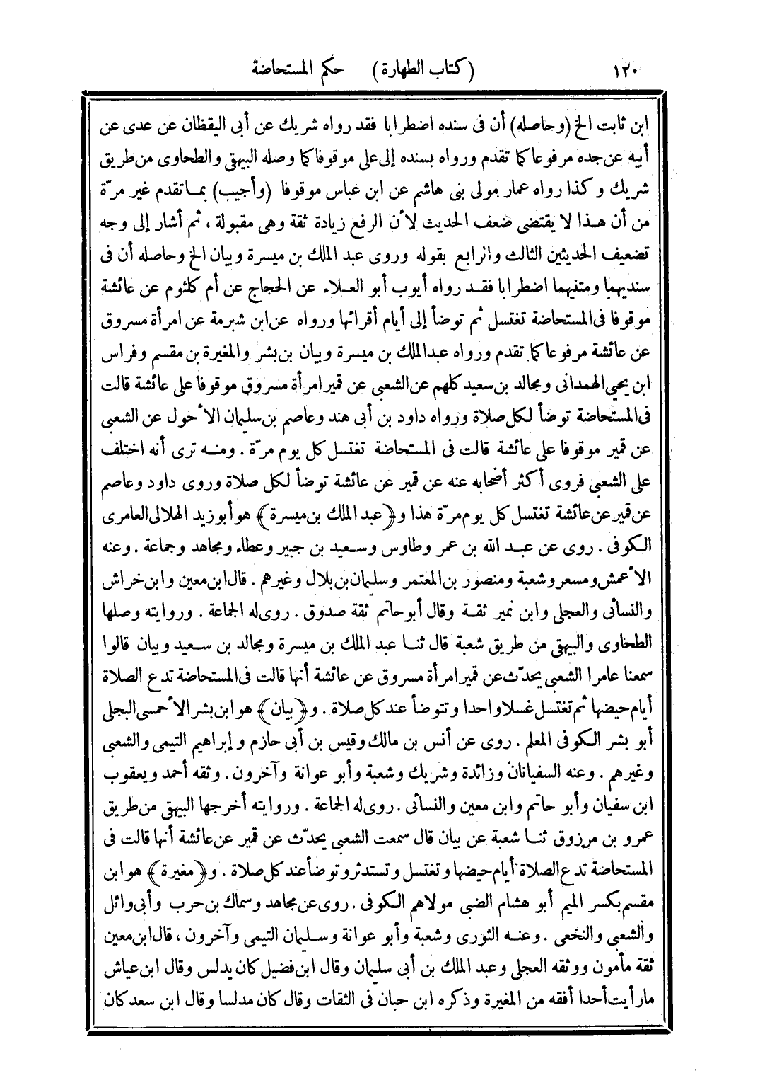 ابن ثابت الخ (وحاصله) أن في سنده اضطرابا فقد رواه شريك عن أبي اليقظان عن عدى عن أبيه عن جده مرفوعا كما تقدم ورواه بسنده إلى على موقوفا كما وصله البيهقي والطحاوى من طريق شريك وكذا رواه عمار مولى بنى هاشم عن ابن عباس موقوفا (وأجيب) بما تقدم غير مرّة من أن هذا لا يقتضى ضعف الحديث لأن الرفع زيادة ثقة وهي مقبولة، ثم أشار إلى وجه تضعيف الحديثين الثالث والرابع بقوله وروى عبد الملك بن ميسرة وبيان الخ وحاصله أن في سنديهما ومتنيهما اضطرابا فقد رواه أيوب أبو العلاء عن الحجاج عن أم كلثوم عن عائشة موقوفا في المستحاضة تغتسل ثم توضأ إلى أيام أقرائها ورواه عن ابن شبرمة عن امرأة مسروق عن عائشة مرفوعا كما تقدم ورواه عبد الملك بن ميسرة وبيان بن بشر والمغيرة بن مقسم وفراس ابن يحيى الهمداني ومجالد بن سعيد كلهم عن الشعبى عن قمير امرأة مسروق موقوفا على عائشة قالت في المستحاضة توضأ لكل صلاة ورواه داود بن أبي هند وعاصم بن سليمان الأحول عن الشعبي عن قمير موقوفا على عائشة قالت في المستحاضة تغتسل كل يوم مرّة. ومنه ترى أنه اختلف على الشعبى فروى أكثر أصحابه عنه عن قمير عن عائشة توضأ لكل صلاة وروى داود وعاصم عن قمير عن عائشة تغتسل كل يوم مرّة هذا و (عبد الملك بن ميسرة) هو أبو زيد الهلالى العامرى الكوفي. روى عن عبد الله بن عمر وطاوس وسعيد بن جبير وعطاء ومجاهد وجماعة. وعنه الأعمش ومسعر وشعبة ومنصور بن المعتمر وسليمان بن بلال وغيرهم. قال ابن معين وابن خراش والنسائى والعجلى وابن نمير ثقة وقال أبو حاتم ثقة صدوق. روى له الجماعة. وروايته وصلها الطحاوى والبيهقى من طريق شعبة قال ثنا عبد الملك بن ميسرة ومجالد بن سعيد وبيان قالوا سمعنا عامرا الشعبي يحدّث عن قمير امرأة مسروق عن عائشة أنها قالت في المستحاضة تدع الصلاة أيام حيضها ثم تغتسل غسلا واحدا وتتوضأ عند كل صلاة. و (بيان) هو ان بشر الأحمسي البجلى أبو بشر الكوفي المعلم. روى عن أنس بن مالك وقيس بن أبى حازم وإبراهيم التيمى والشعبى وغيرهم. وعنه السفيانان وزائدة وشريك وشعبة وأبو عوانة وآخرون. وثقه أحمد ويعقوب ابن سفيان وأبو حاتم وابن معين والنسائى. روى له الجماعة. وروايته أخرجها البيهقى من طريق عمرو بن مرزوق ثنا شعبة عن بيان قال سمعت الشعبي يحدّث عن قمير عن عائشة أنها قالت في المستحاضة تدع الصلاة. أيام حيضها وتغتسل وتستدثر وتوضأ عند كل صلاة. و (مغيرة) هو ابن مقسم بكسر الميم أبو هشام الضبي مولاهم الكوفي. روى عن مجاهد وسماك بن حرب وأبي وائل والشعبي والنخعى. وعنه الثورى وشعبة وأبو عوانة وسليمان التيمى وآخرون، قال ابن معين ثقة مأمون ووثقه العجلى وعبد الملك بن أبى سليمان وقال ابن فضيل كان يدلس وقال ابن عياش ما رأيت أحدا أفقه من المغيرة وذكره ابن حبان في الثقات وقال كان مدلسا وقال ابن سعد كان