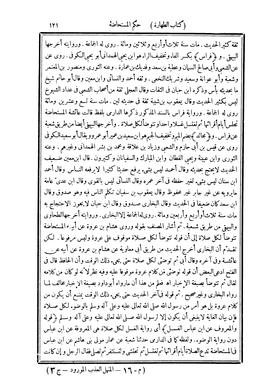 ثقة كثير الحديث. مات سنة ثلاث أو أربع وثلاثين ومائة. روى له الجماعة. وروايته أخرجها البيهقى. و (فراس) بكسر الفاء وتخفيف الراء هو ابن يحيى الهمداني أبو يحيى الكوفى. روى عن عن الشعبي وأبى صالح السمان وعطية بن سعد وفديك بن عمارة. وعنه الثورى ومنصور بن المعتمر وشعبة وأبو عوانة وسعيد وشريك النخعى. وثقه أحمد والنسائى وابن معين وقال أبو حاتم شيخ ما بحديثه بأس وذكره ابن حبان في الثقات وقال العجلي ثقة من أصحاب الشعبي في عداد الشيوخ ليس بكثير الحديث وقال يعقوب بن شيبة ثقة في حديثه لين. مات سنة تسع وعشرين ومائة روى له الجماعة. ورواية فراس بالسند المذكور ذكرها الدارمى بلفظ قالت عائشة المستحاضة تجلس أيام أقرائها ثم تغتسل غسلا واحدا وتتوضأ لكل صلاة. وأخرجها البيهقى أيضا من طريق شعبة عن فراس. و (مجالد) بضم الميم وتخفيف الجيم هو ابن سعيد بن عمير أبو عمرو ويقال أبو سعيد الكوفى روى عن قيس بن أبى حازم والشعبي وزياد بن علاقة ومحمد بن بشر الهمداني وغيرهم. وعنه الثورى وابن عيينة ويحيى القطان وابن المبارك والسفيانان وكثيرون. قال ابن معين ضعيف الحديث لا يحتج بحديثه وقال أحمد ليس بشئ يرفع حديثا كثيرا لا يرفعه الناس وقال أحمد ابن سنان ليس بشئ تغير حفظه في آخر عمره وقال النسائى ليس بالقوى وقال ابن عدىّ عامة ما يرويه عن غير جابر غير محفوظ وقال يعقوب بن سفيان تكلم الناس فيه وهو صدوق وقال ابن سعد كان ضعيفا في الحديث وقال البخارى صدوق وقال ابن حبان لا يجوز الاحتجاج به مات سنة ثلاث أو أربع وأربعين ومائة. روى له الجماعة إلا البخارى. وروايته أخرجها الطحاوى والبيهقى من طريق شعبة. ثم أشار المصنف بقوله وروى هشام بن عروة عن أبيه المستحاضة تتوضأ لكل صلاة إلى أن قوله تتوضأ لكل صلاة موقوف على عروة وليس مرفوعا. لكن تقدّم أن البخارى أخرج الحديث من طريق أبى معاوية عن هشام بن عروة عن أبيه عن عائشة وفى آخره وقال أبى ثم توضئى لكل صلاة حتى يجيء ذلك الوقت وأن الحافظ قال في الفتح ادعى البعض أن قوله توضئي من كلام عروة موقوفا عليه وفيه نظر لأنه لو كان من كلامه لقال ثم تتوضأ بصيغة الإخبار اهـ فعلم من هذا أن ما رواه أبو داود بصيغة الإخبار مخالف لما رواه البخارى وغير صحيح. ثم قوله في آخر الحديث حتى يجئ ذلك الوقت يمنع أن يكون من كلام عروة بل هو أمر من رسول الله صلى الله تعالى عليه وعلى آله وسلم بالوضوء لكل صلاة فإن بيان الغاية لا ينبغى أن يكون إلا لرسول الله صلى الله تعالى عليه وعلى آله وسلم
