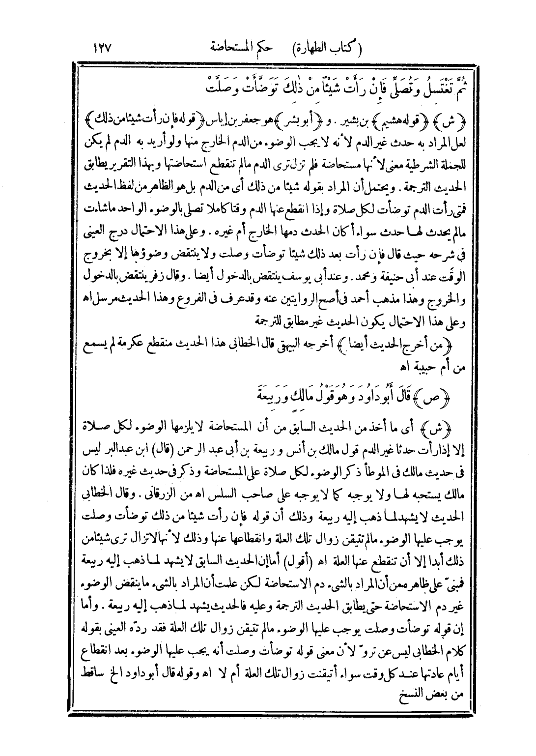 (ش) أى ما أخذ من الحديث السابق من أن المستحاضة لا يلزمها الوضوء لكل صلاة إلا إذا رأت حدثا غير الدم قول مالك بن أنس وربيعة بن أبى عبد الرحمن (قال) ابن عبد البر ليس في حديث مالك في الموطأ ذكر الوضوء لكل صلاة على المستحاضة وذكر في حديث غيره فلذا كان مالك يستحبه لها ولا يوجبه كما لا يوجبه على صاحب السلس اهـ من الزرقاني. وقال الخطابى الحديث لا يشهد لما ذهب إليه ربيعة وذلك أن قوله فإن رأت شيئا من ذلك توضأت وصلت يوجب عليها الوضوء ما لم تتيقن زوال تلك العلة وانقطاعها عنها وذلك لأنها لا تزال ترى شيئا من ذلك أبدا إلا أن تنقطع عنها العلة اهـ (أقول) أما إن الحديث السابق لا يشهد لما ذهب إليه ربيعة فمبنىّ على ظاهره من أن المراد بالشئ دم الاستحاضة لكن علمت أن المراد بالشئ ما ينقض الوضوء غير دم الاستحاضة حتى يطابق الحديث الترجمة وعليه فالحديث يشهد لما ذهب إليه ربيعة. وأما إن قوله توضأت وصلت يوجب عليها الوضوء ما لم تتيقن زوال تلك العلة فقد ردّه العينى بقوله كلام الخطابى ليس عن تروّ لأن معنى قوله توضأت وصلت أنه يجب عليها الوضوء بعد انقطاع أيام عادتها عند كل وقت سواء أتيقنت زوال تلك العلة أم لا اهـ وقوله قال أبو داود الخ ساقط من بعض النسخ