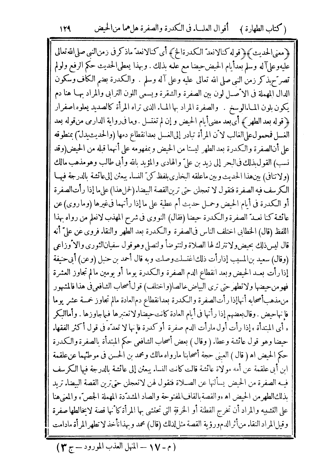 (قوله كنا لا نعدّ الكدرة الخ) أى كنا لا نعدّ ما ذكر في زمن النبي صلى الله تعالى عليه وعلى آله وسلم بعد أيام الحيض حيضا مع علمه بذلك. وبهذا يعطى الحديث حكم الرفع ولو لم تصرّح بذكر زمن النبى صلى الله تعالى عليه وعلى آله وسلم. والكدرة بضم الكاف وسكون الدال المهملة في الأصل لون بين الصفرة والشقرة ويسمى اللون الترابى والمراد بها هنا دم يكون بلون الماء الوسخ. والصفرة المراد بها الماء الذي تراه المرأة كالصديد يعلوه اصفرار