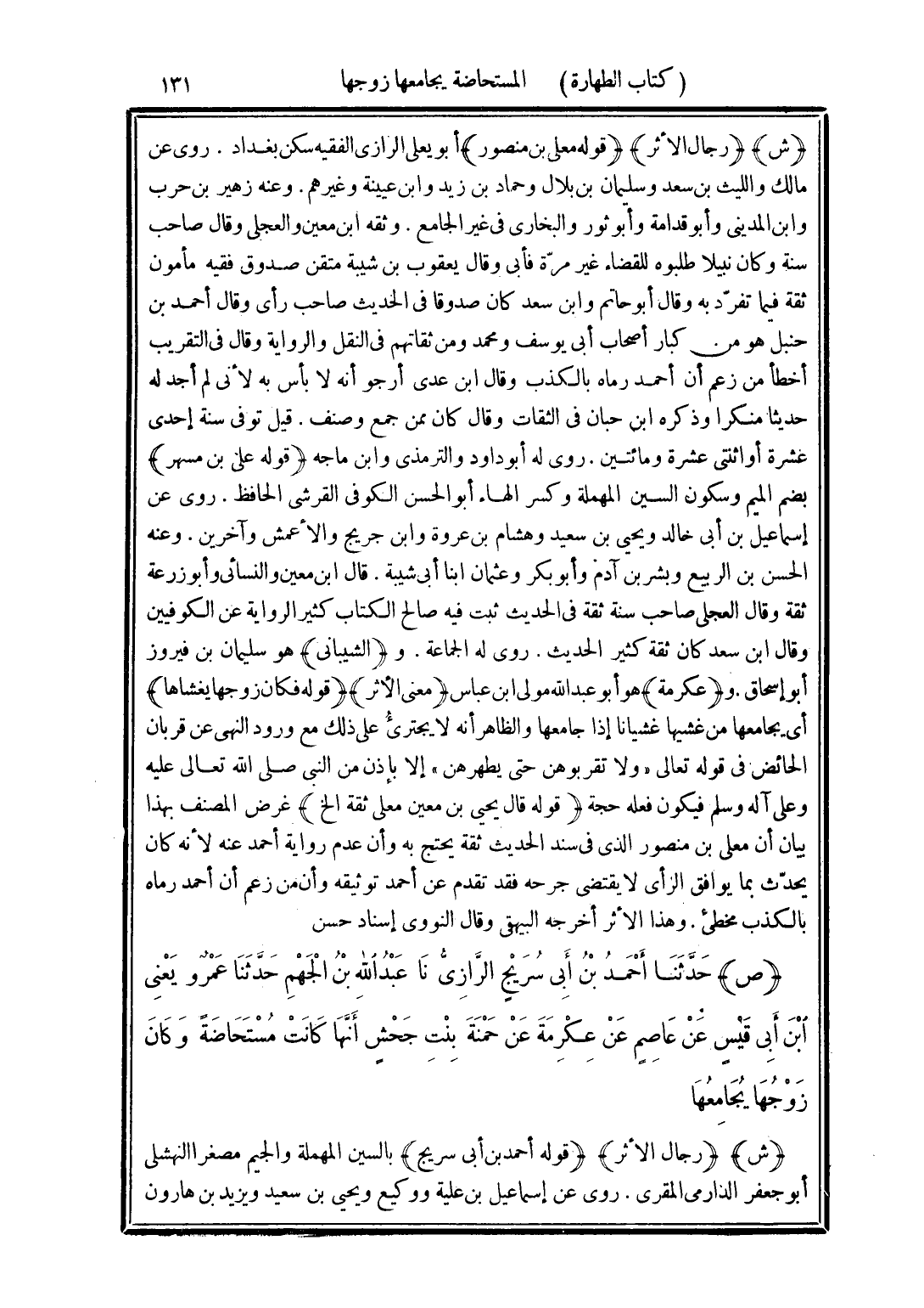 (ص) حَدَّثَنَا أَحْمَدُ بْنُ أَبِي سُرَيْجٍ الرَّازِيُّ، نَا عَبْدُ اللَّهِ بْنُ الْجَهْمِ، حَدَّثَنَا عَمْرُو يعني بْنُ أَبِي قَيْسٍ، عَنْ عَاصِمٍ، عَنْ عِكْرِمَةَ، عَنْ حَمْنَةَ بِنْتِ جَحْشٍ، «أَنَّهَا كَانَتْ مُسْتَحَاضَةً وَكَانَ زَوْجُهَا يُجَامِعُهَا»