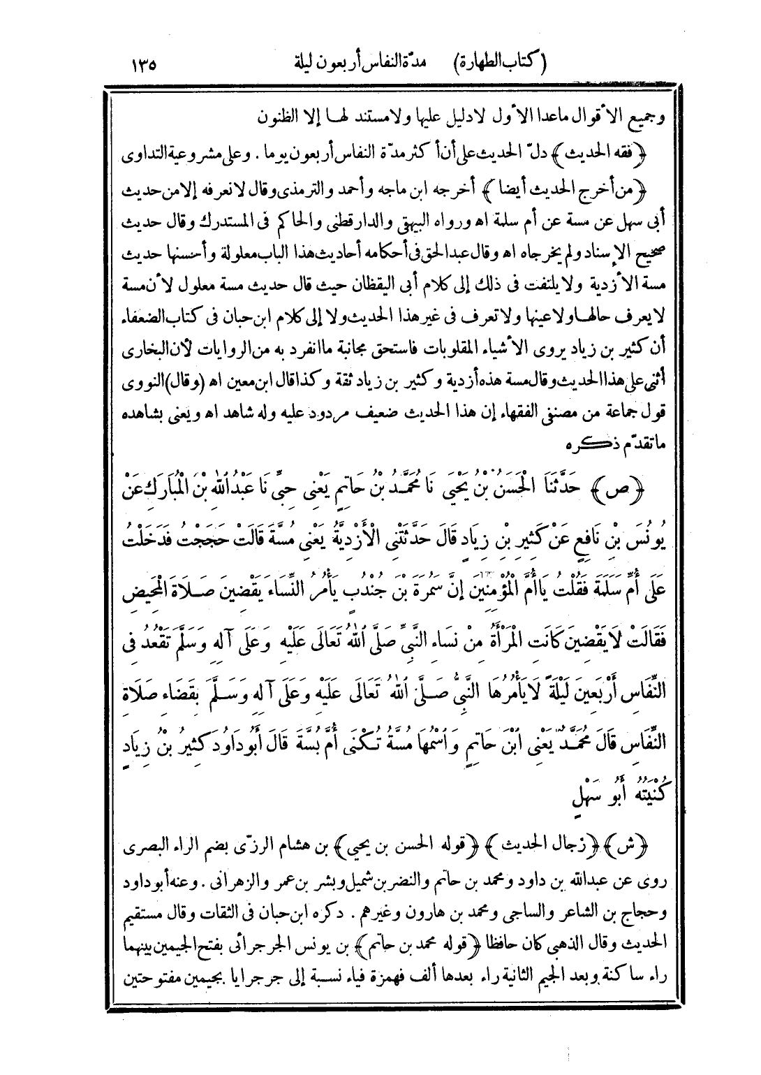 (ص) حَدَّثَنَا الْحَسَنُ بْنُ يَحْيَى، نَا مُحَمَّدُ بْنُ حَاتِمٍ يَعْنِي حُبِّي، نَا عَبْدُ اللَّهِ بْنُ الْمُبَارَكِ، عَنْ يُونُسَ بْنِ نَافِعٍ، عَنْ كَثِيرِ بْنِ زِيَادٍ، قَالَ: حَدَّثَتْنِي الْأَزْدِيَّةُ يَعْنِي مُسَّةَ قَالَتْ: حَجَجْتُ فَدَخَلْتُ عَلَى أُمِّ سَلَمَةَ فَقُلْتُ: يَا أُمَّ الْمُؤْمِنِينَ، إِنَّ سَمُرَةَ بْنَ جُنْدُبٍ يَأْمُرُ النِّسَاءَ يَقْضِينَ صَلَاةَ الْمَحِيضِ فَقَالَتْ: «لَا يَقْضِينَ كَانَتِ الْمَرْأَةُ مِنْ نِسَاءِ النَّبِيِّ صَلَّى اللهُ تَعَالَى عَلَيْهِ وَعَلَى آلِهِ وسَلَّمَ تَقْعُدُ فِي النِّفَاسِ أَرْبَعِينَ لَيْلَةً لَا يَأْمُرُهَا النَّبِيُّ صَلَّى اللهُ تَعَالَى عَلَيْهِ وَعَلَى آلِهِ وسَلَّمَ بِقَضَاءِ صَلَاةِ النِّفَاسِ» قَالَ مُحَمَّدٌ يَعْنِي ابْنَ حَاتِم: وَاسْمُهَا مُسَّةُ تُكْنَى أُمَّ بُسَّةَ قَالَ أَبُو دَاوُدَ: كَثِيرُ بْنُ زِيَادٍ كُنْيَتُهُ أَبُو سَهْلٍ