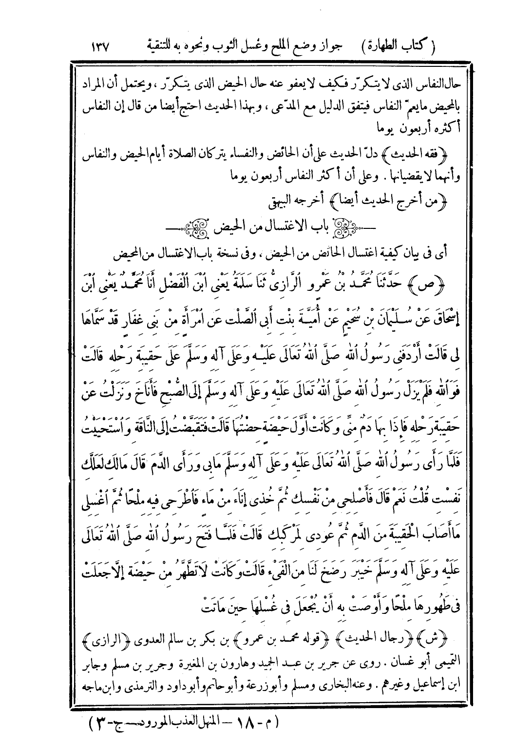 حال النفاس الذى لا يتكرّر فكيف لا يعفو عنه حال الحيض الذى يتكرّر، ويحتمل أن المراد بالمحيض ما يعمّ النفاس فيتفق الدليل مع المدّعي، وبهذا الحديث احتج أيضا من قال إن النفاس أكثره أربعون يوما