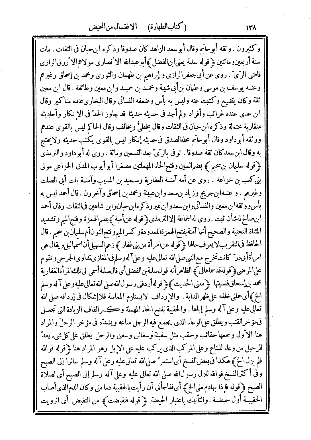 (قوله سلمة يعنى ابن الفضل) أبو عبد الله الأنصارى مولاهم الأزرق الرازى قاضى الرّىّ. روى عن أبى جعفر الرازى وإبراهيم بن طهمان والثورى ومحمد بن إسحاق وغيرهم وعنه يوسف بن موسى وعثمان بن أبي شيبة ومحمد بن حميد وابن معين وطائفة. قال ابن معين ثقة وكان يتشيع وكتبت عنه وليس به بأس وضعفه النسائى وقال البخارى عنده مناكير وقال ابن عدى عنده غرائب وأفراد ولم أجد في حديثه حديثا قد جاوز الحدّ في الإنكار وأحاديثه متقاربة محتملة وذكره ابن حبان في الثقات وقال يخطئُ ويخالف وقال الحاكم ليس بالقوى عندهم ووثقه أبو داود وقال أبو حاتم محله الصدق في حديثه إنكار ليس بالقوى يكتب حديثه ولا يحتج به وقال ابن سعد كان ثقة صدوقا. توفي بالرّىّ بعد التسعين ومائة. روى له أبو داود، والترمذى