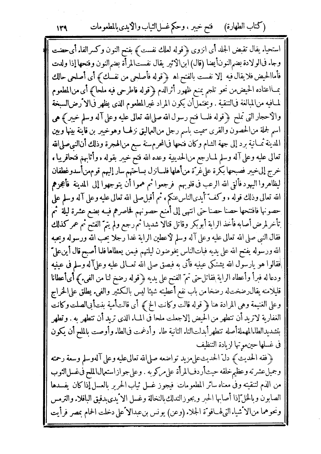 (فقه الحديث) دلّ الحديث على مزيد تواضعه صلى الله تعالى عليه وعلى آله وسلم وسعة رحمته وجميل عشرته وعظيم خلقه حيث أردف المرأة على مركوبه. وعلى جواز استعمال الملح في غسل الثوب من الدم لتنقيته وفي معناه سائر المطعومات فيجوز غسل ثياب الحرير بالعسل إذا كان يفسدها الصابون وبالخلّ إذا أصابها الحبر ويجوز التدلك بالنخالة وغسل الأيدى بدقيق الباقلاء والترمس ونحوهما من الأشياء التى لها قوّة الجلاء (وعن) يونس بن عبد الأعلى دخلت الحمام بمصر فرأيت