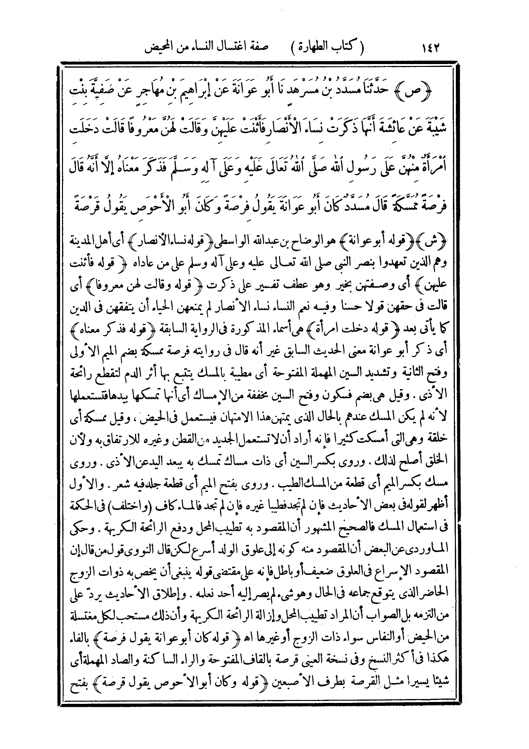 (ص) حَدَّثَنَا مُسَدَّدُ بْنُ مُسَرْهَدٍ، نَا أَبُو عَوَانَةَ، عَنْ إِبْرَاهِيمَ بْنِ مُهَاجِرٍ، عَنْ صَفِيَّةَ بِنْتِ شَيْبَةَ، عَنْ عَائِشَةَ أَنَّهَا ذَكَرَتْ نِسَاءَ الْأَنْصَارِ، فَأَثْنَتْ عَلَيْهِنَّ وَقَالَتْ لَهُنَّ: مَعْرُوفًا، وَقَالَتْ: دَخَلَتِ امْرَأَةٌ مِنْهُنَّ عَلَى رَسُولِ اللَّهِ صَلَّى اللهُ تَعَالَى عَلَيْهِ وَعَلَى آلِهِ وسَلَّمَ، فَذَكَرَ مَعْنَاهُ إِلَّا أَنَّهُ قَالَ «فِرْصَةً مُمَسَّكَةً». قَالَ مُسَدَّدٌ: كَانَ أَبُو عَوَانَةَ يَقُولُ: «فِرْصَةً»، وَكَانَ أَبُو الْأَحْوَصِ يَقُولُ: «قَرْصَةً».
