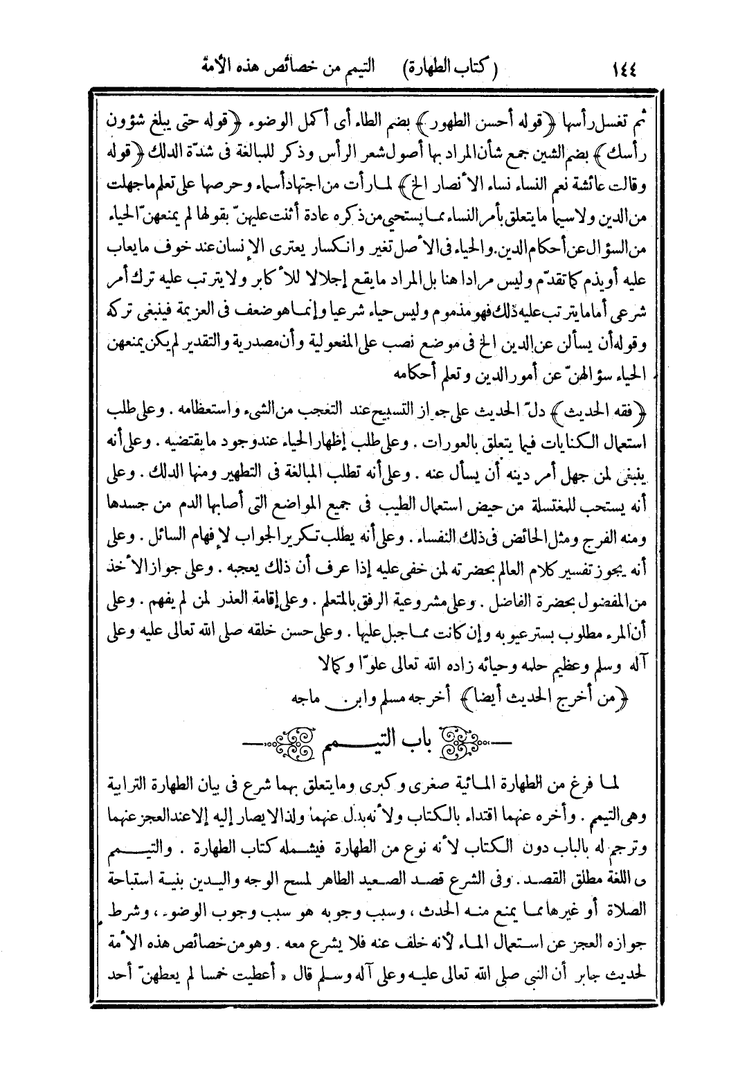 لما فرغ من الطهارة المائية صغرى وكبرى وما يتعلق بهما شرع في بيان الطهارة الترابية وهي التيمم. وأخره عنهما اقتداء بالكتاب ولأنه بدل عنهما ولذا لا يصار إليه إلا عند العجز عنهما وترجم له بالباب دون الكتاب لأنه نوع من الطهارة فيشمله كتاب الطهارة. والتيمم في اللغة مطلق القصد. وفي الشرع قصد الصعيد الطاهر لمسح الوجه واليدين بنية استباحة الصلاة أو غيرها مما يمنع منه الحدث، وسبب وجوبه هو سبب وجوب الوضوء، وشرط جوازه العجز عن استعمال الماء لأنه خلف عنه فلا يشرع معه. وهو من خصائص هذه الأمة لحديث جابر أن النبى صلى الله تعالى عليه وعلى آله وسلم قال "أعطيت خمسا لم يعطهنّ أحد