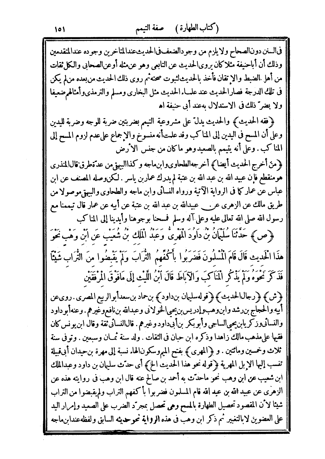 (ص) حَدَّثَنَا سُلَيْمَانُ بْنُ دَاوُدَ الْمَهْرِيُّ وَعَبْدُ الْمَلِكِ بْنُ شُعَيْبٍ، عَنِ ابْنِ وَهْبٍ، نَحْوَ هَذَا الْحَدِيثِ قَالَ: «قَامَ الْمُسْلِمُونَ فَضَرَبُوا بِأَكُفِّهِمُ التُّرَابَ، وَلَمْ يَقْبِضُوا مِنَ التُّرَابِ شَيْئًا»، فَذَكَرَ نَحْوَهُ، وَلَمْ يَذْكُرِ الْمَنَاكِبَ وَالْآبَاطَ قَالَ: ابْنُ اللَّيْثِ: «إِلَى مَا فَوْقَ الْمِرْفَقَيْنِ»