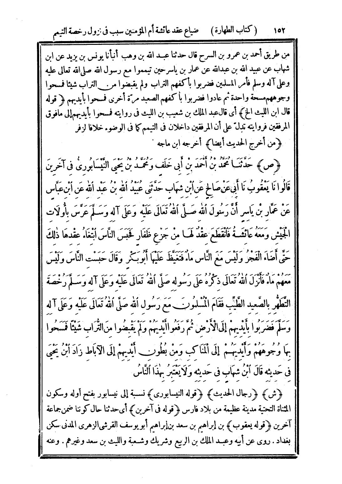 (ص) حَدَّثَنَا مُحَمَّدُ بْنُ أَحْمَدَ بْنِ أَبِي خَلَفٍ، وَمُحَمَّدُ بْنُ يَحْيَى النَّيْسَابُورِيُّ فِي آخَرِينَ قَالُوا: نَا يَعْقُوبُ، نَا أَبِي، عَنْ صَالِحٍ، عَنِ ابْنِ شِهَابٍ، حَدَّثَنِي عُبَيْدُ اللَّهِ بْنُ عَبْدِ اللَّهِ، عَنِ ابْنِ عَبَّاسٍ، عَنْ عَمَّارِ بْنِ يَاسِرٍ، " أَنَّ رَسُولَ اللَّهِ صَلَّى اللهُ تَعَالَى عَلَيْهِ وَعَلَى آلِهِ وسَلَّمَ عَرَّسَ بِأُولَاتِ الْجَيْشِ وَمَعَهُ عَائِشَةُ فَانْقَطَعَ عِقْدٌ لَهَا مِنْ جَزْعِ ظَفَارٍ، فَحَبَسَ النَّاسَ ابْتِغَاءَ عِقْدِهَا ذَلِكَ حَتَّى أَضَاءَ الْفَجْرُ، وَلَيْسَ مَعَ النَّاسِ مَاءٌ فَتَغَيَّظَ عَلَيْهَا أَبُو بَكْرٍ وَقَالَ: حَبَسْتِ النَّاسَ وَلَيْسَ مَعَهُمْ مَاءٌ، فَأَنْزَلَ اللَّهُ تَعَالَى ذكره عَلَى رَسُولِهِ صَلَّى اللهُ تَعَالَى عَلَيْهِ وَعَلَى آلِهِ وسَلَّمَ رُخْصَةَ التَّطَهُّرِ بِالصَّعِيدِ الطَّيِّبِ، فَقَامَ الْمُسْلِمُونَ مَعَ رَسُولِ اللَّهِ صَلَّى اللهُ تَعَالَى عَلَيْهِ وَسَلَّمَ فَضَرَبُوا بِأَيْدِيهِمْ إِلَى الْأَرْضِ، ثُمَّ رَفَعُوا أَيْدِيَهُمْ، وَلَمْ يَقْبِضُوا مِنَ التُّرَابِ شَيْئًا، فَمَسَحُوا بِهَا وُجُوهَهُمْ وَأَيْدِيَهُمْ إِلَى الْمَنَاكِبِ، وَمِنْ بِطُونِ أَيْدِيهِمْ إِلَى الْآبَاطِ " زَادَ ابْنُ يَحْيَى فِي حَدِيثِهِ قَالَ ابْنُ شِهَابٍ فِي حَدِيثِهِ: «وَلَا يَعْتَبِرُ بِهَذَا النَّاسُ».