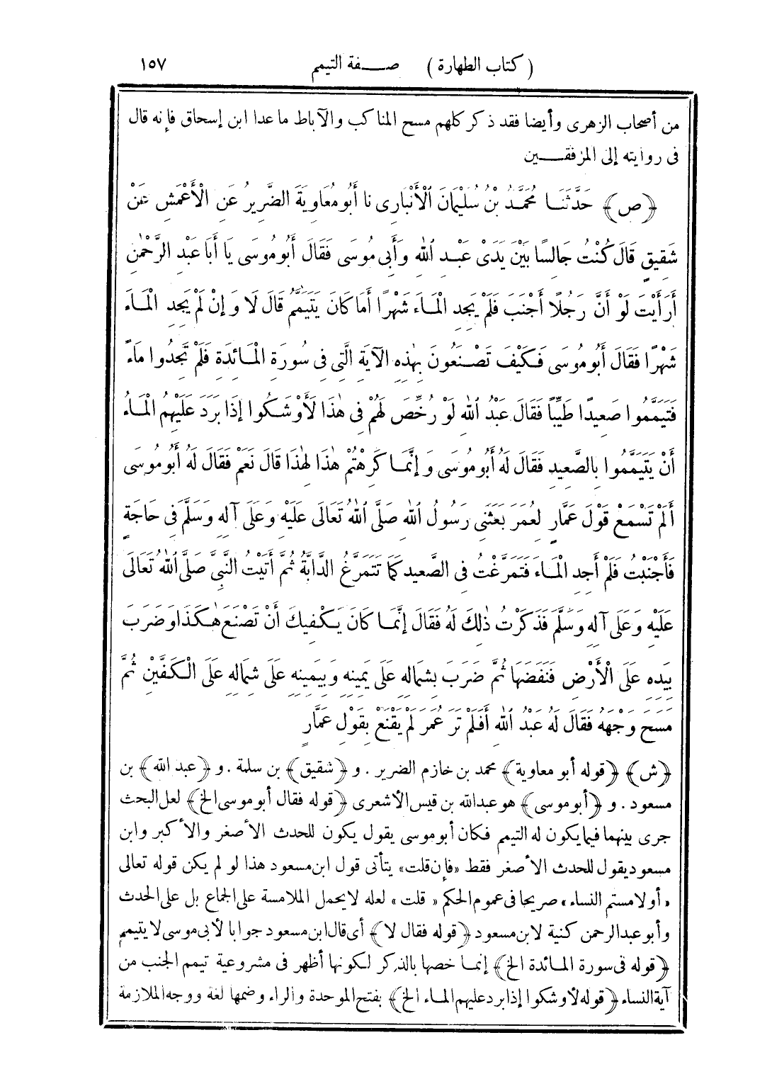 (ص) حَدَّثَنَا مُحَمَّدُ بْنُ سُلَيْمَانَ الْأَنْبَارِيُّ، نَا أَبُو مُعَاوِيَةَ الضَّرِيرُ، عَنِ الْأَعْمَشِ، عَنْ شَقِيقٍ قَالَ: كُنْتُ جَالِسًا بَيْنَ عَبْدِ اللَّهِ، وَأَبِي مُوسَى، فقَالَ أَبُو مُوسَى: يَا أَبَا عَبْدِ الرَّحْمَنِ أَرَأَيْتَ لَوْ أَنَّ رَجُلًا أَجْنَبَ فَلَمْ يَجِدِ الْمَاءَ شَهْرًا أَمَا كَانَ يَتَيَمَّمُ؟ فَقَالَ: لَا، وَإِنْ لَمْ يَجِدِ الْمَاءَ شَهْرًا. فَقَالَ أَبُو مُوسَى: فَكَيْفَ تَصْنَعُونَ بِهَذِهِ الْآيَةِ الَّتِي فِي سُورَةِ الْمَائِدَةِ {فَلَمْ تَجِدُوا مَاءً فَتَيَمَّمُوا صَعِيدًا طَيِّبًا} [النساء: 43] فَقَالَ عَبْدُ اللَّهِ: لَوْ رُخِّصَ لَهُمْ فِي هَذَا لَأَوْشَكُوا إِذَا بَرَدَ عَلَيْهِمُ الْمَاءُ أَنْ يَتَيَمَّمُوا بِالصَّعِيدِ. فَقَالَ لَهُ أَبُو مُوسَى: وَإِنَّمَا كَرِهْتُمْ هَذَا لِهَذَا. قَالَ: نَعَمْ. فَقَالَ لَهُ أَبُو مُوسَى: أَلَمْ تَسْمَعْ قَوْلَ عَمَّارٍ لِعُمَرَ بَعَثَنِي رَسُولُ اللَّهِ صَلَّى اللهُ تَعَالَى عَلَيْهِ وَعَلَى آلِهِ وسَلَّمَ فِي حَاجَةٍ فَأَجْنَبْتُ، فَلَمْ أَجِدَ الْمَاءَ فَتَمَرَّغْتُ فِي الصَّعِيدِ كَمَا تَتَمَرَّغُ الدَّابَّةُ، ثُمَّ أَتَيْتُ النَّبِيَّ صَلَّى اللهُ تَعَالَى عَلَيْهِ وَعَلَى آلِهِ وَسَلَّمَ، فَذَكَرْتُ ذَلِكَ لَهُ فَقَالَ: «إِنَّمَا كَانَ يَكْفِيكَ أَنْ تَصْنَعَ هَكَذَا وَضَرَبَ بِيَدِهِ عَلَى الْأَرْضِ فَنَفَضَهَا، ثُمَّ ضَرَبَ بِشِمَالِهِ عَلَى يَمِينِهِ وَبِيَمِينِهِ عَلَى شِمَالِهِ عَلَى الْكَفَّيْنِ، ثُمَّ مَسَحَ وَجْهَهُ» فَقَالَ لَهُ عَبْدُ اللَّهِ: أَفَلَمْ تَرَ عُمَرَ لَمْ يَقْنَعْ بِقَوْلِ عَمَّارٍ
