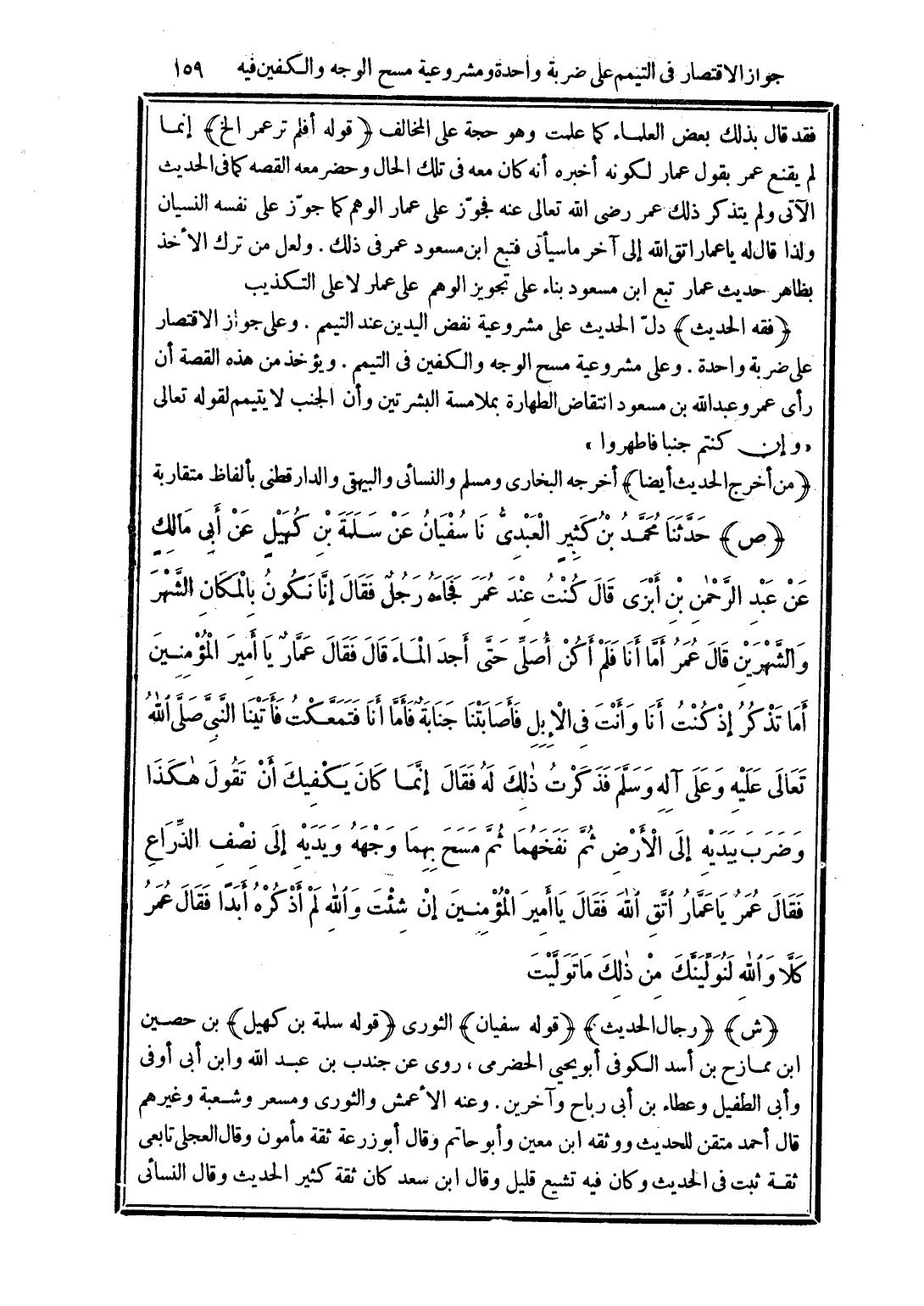 (ص) حَدَّثَنَا مُحَمَّدُ بْنُ كَثِيرٍ الْعَبْدِيُّ، نَا سُفْيَانُ، عَنْ سَلَمَةَ بْنِ كُهَيْلٍ، عَنْ أَبِي مَالِكٍ، عَنْ عَبْدِ الرَّحْمَنِ بْنِ أَبْزَى قَالَ: كُنْتُ عِنْدَ عُمَرَ فَجَاءَهُ رَجُلٌ فَقَالَ: إِنَّا نَكُونُ بِالْمَكَانِ الشَّهْرَ وَالشَّهْرَيْنِ فَقَالَ عُمَرُ: أَمَّا أَنَا فَلَمْ أَكُنْ أُصَلِّي حَتَّى أَجِدَ الْمَاءَ. قَالَ: فَقَالَ عَمَّارٌ: يَا أَمِيرَ الْمُؤْمِنِينَ أَمَا تَذْكُرُ إِذْ كُنْتُ أَنَا وَأَنْتَ فِي الْإِبِلِ، فَأَصَابَتْنَا جَنَابَةٌ، فَأَمَّا أَنَا، فَتَمَعَّكْتُ، فَأَتَيْنَا النَّبِيَّ صَلَّى اللهُ تَعَالَى عَلَيْهِ وَعَلَى آلِهِ وَسَلَّمَ، فَذَكَرْتُ ذَلِكَ لَهُ، فَقَالَ: «إِنَّمَا كَانَ يَكْفِيكَ أَنْ تَقُولَ هَكَذَا، وَضَرَبَ بِيَدَيْهِ إِلَى الْأَرْضِ، ثُمَّ نَفَخَهُمَا، ثُمَّ مَسَحَ بِهِمَا وَجْهَهُ وَيَدَيْهِ إِلَى نِصْفِ الذِّرَاعِ» فَقَالَ عُمَرُ: يَا عَمَّارُ اتَّقِ اللَّهَ، فَقَالَ: يَا أَمِيرَ الْمُؤْمِنِينَ، إِنْ شِئْتَ وَاللَّهِ لَمْ أَذْكُرْهُ أَبَدًا، فَقَالَ عُمَرُ: كَلَّا وَاللَّهِ لَنُوَلِّيَنَّكَ مِنْ ذَلِكَ مَا تَوَلَّيْتَ