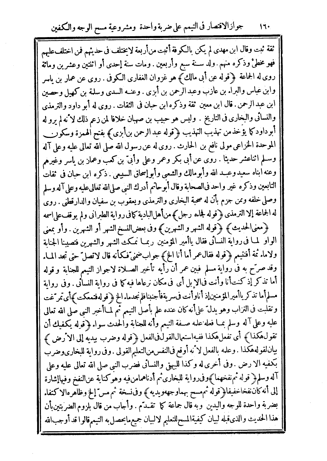 (قوله ثم مسح بهما وجهه ويديه) وفي نسخة ثم مسّ إلخ وظاهره الاكتفاء بضربة واحدة للوجه واليدين وبه قال جماعة كما تقدّم. وأجاب من قال بلزوم الضربتين بأن هذا الحديث والذى قبله لبيان كيفية المسح للتعليم لا لبيان جميع ما يحصل به التيمم قالوا قد أوجب الله