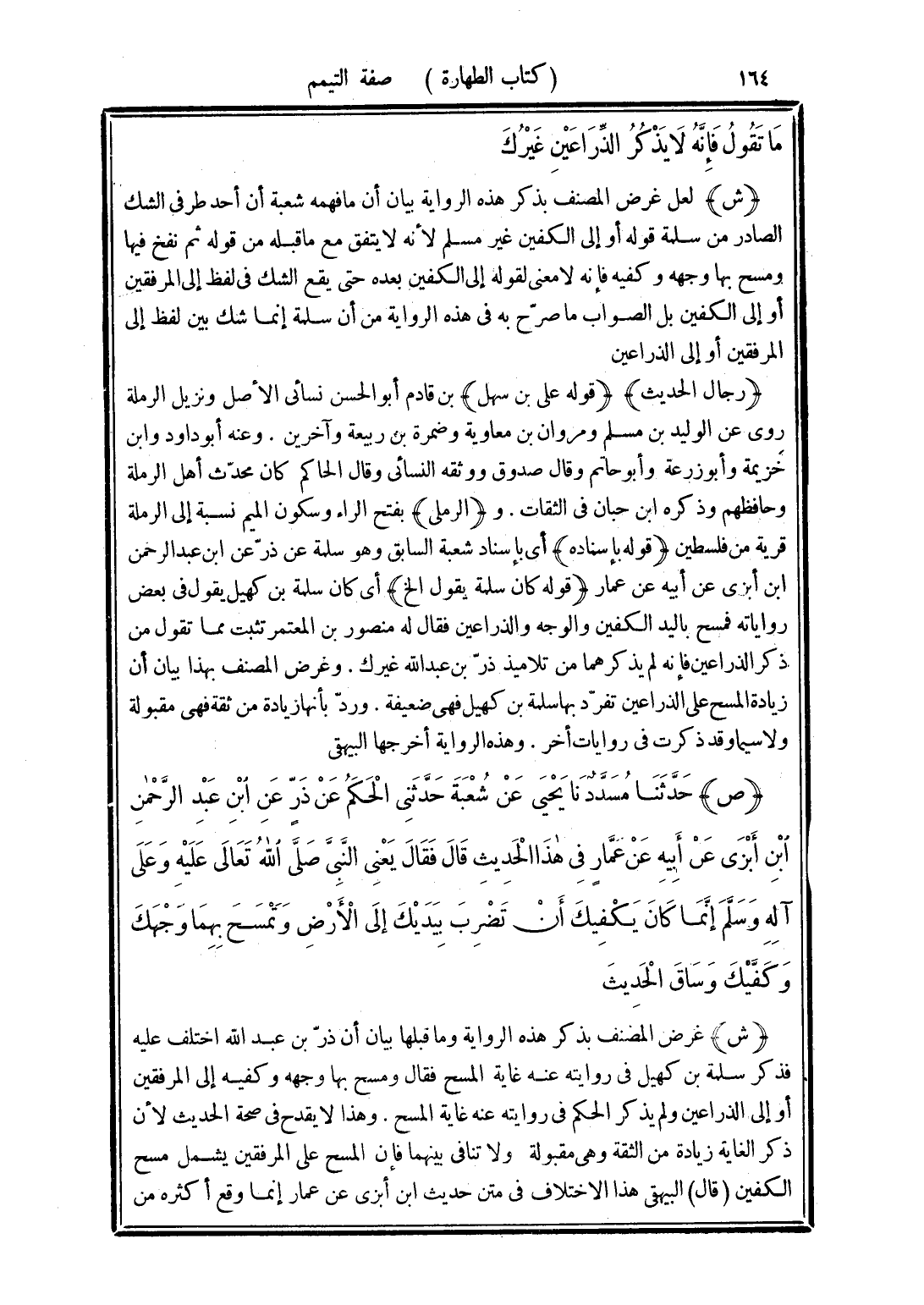 (ش) لعل غرض المصنف بذكر هذه الرواية بيان أن ما فهمه شعبة أن أحد طرفي الشك الصادر من سلمة قوله أو إلى الكفين غير مسلم لأنه لا يتفق مع ما قبله من قوله ثم نفخ فيها ومسح بها وجهه وكفيه فإنه لا معنى لقوله إلى الكفين بعده حتى يقع الشك في لفظ إلى المرفقين أو إلى الكفين بل الصواب ما صرّح به في هذه الرواية من أن سلمة إنما شك بين لفظ إلى المرفقين أو إلى الذراعين