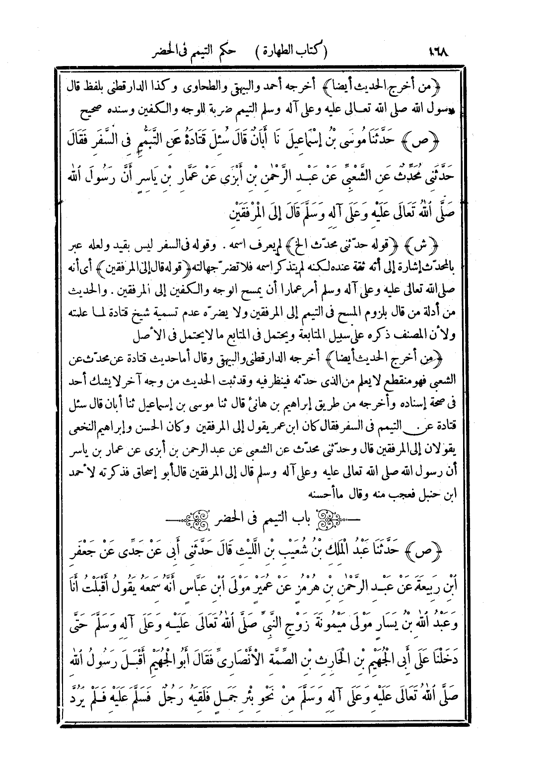 (ص) حَدَّثَنَا مُوسَى بْنُ إِسْمَاعِيلَ، نَا أَبَانُ قَالَ: سُئِلَ قَتَادَةُ، عَنِ التَّيَمُّمِ فِي السَّفَرِ فَقَالَ: حَدَّثَنِي مُحَدِّثٌ، عَنِ الشَّعْبِيِّ، عَنْ عَبْدِ الرَّحْمَنِ بْنِ أَبْزَى، عَنْ عَمَّارِ بْنِ يَاسِرٍ، أَنَّ رَسُولَ اللَّهِ صَلَّى اللهُ تَعَالَى عَلَيْهِ وَعَلَى آلِهِ وسَلَّمَ قَالَ: «إِلَى الْمِرْفَقَيْنِ»