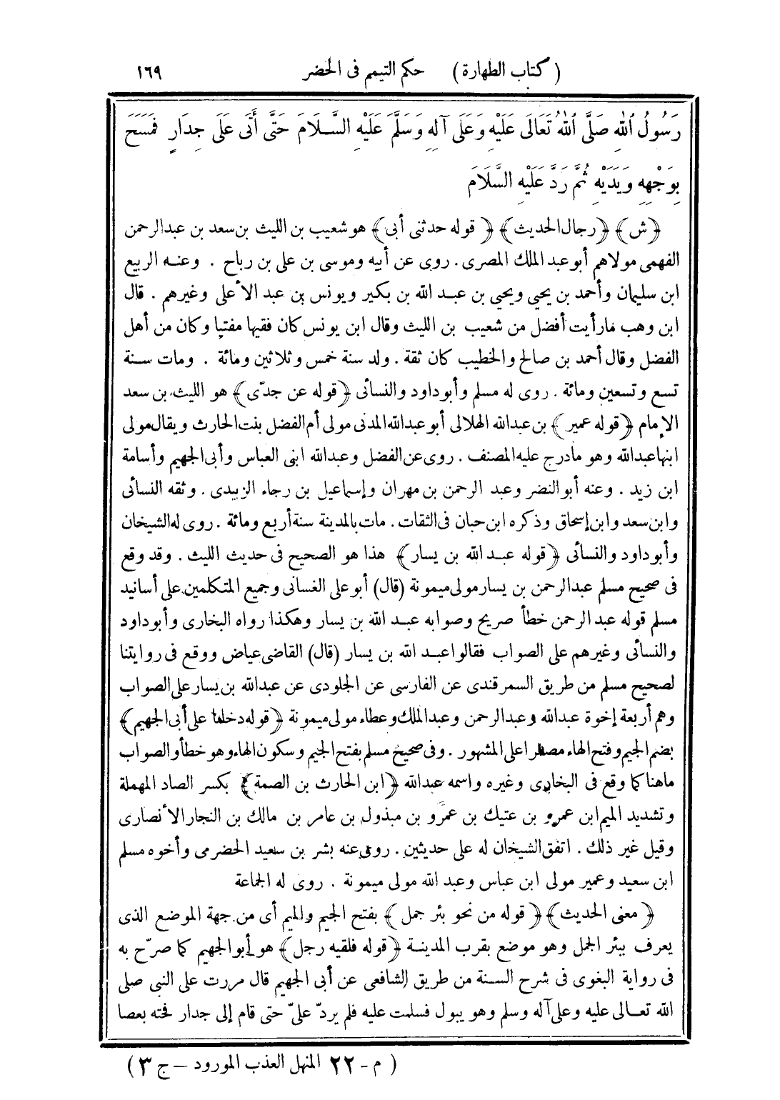 رَسُولُ اللَّهِ صَلَّى اللهُ تَعَالَى عَلَيْهِ وَعَلَى آلِهِ وسَلَّمَ عَلَيْهِ السَّلَامَ حَتَّى أَتَى عَلَى جِدَارٍ، فَمَسَحَ بِوَجْهِهِ وَيَدَيْهِ، ثُمَّ رَدَّ عَلَيْهِ السَّلَامَ»
