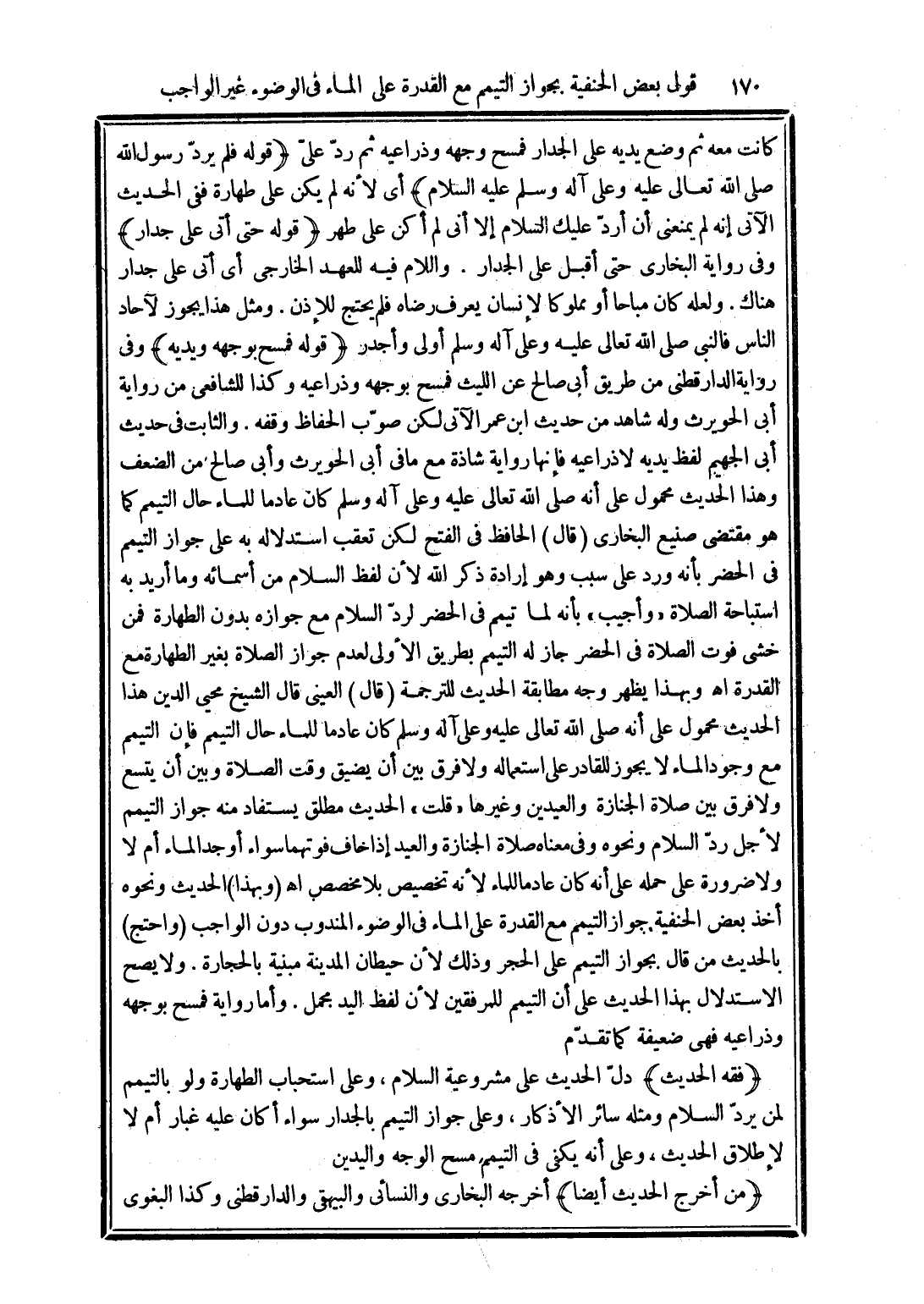 (قوله فمسح بوجهه ويديه) وفي رواية الدارقطنى من طريق أبى صالح عن الليث فمسح بوجهه وذراعيه وكذا للشافعي من رواية أبى الحويرث وله شاهد من حديث ابن عمر الآتي لكن صوّب الحفاظ وقفه. والثابت في حديث أبى الجهيم لفظ يديه لا ذراعيه فإنها رواية شاذة مع ما في أبي الحويرث وأبي صالح من الضعف وهذا الحديث محمول على أنه صلى الله تعالى عليه وعلى آله وسلم كان عادما للماء حال التيمم كما هو مقتضى صنيع البخارى (قال) الحافظ في الفتح لكن تعقب استدلاله به على جواز التيمم في الحضر بأنه ورد على سبب وهو إرادة ذكر الله لأن لفظ السلام من أسمائه وما أريد به استباحة الصلاة "وأجيب" بأنه لما تيمم في الحضر لردّ السلام مع جوازه بدون الطهارة فمن خشى فوت الصلاة في الحضر جاز له التيمم بطريق الأولى لعدم جواز الصلاة بغير الطهارة مع القدرة اهـ وبهذا يظهر وجه مطابقة الحديث للترجمة (قال) العيني قال الشيخ محيي الدين هذا الحديث محمول على أنه صلى الله تعالى عليه وعلى آله وسلم كان عادما للماء حال التيمم فإن التيمم مع وجود الماء لا يجوز للقادر على استعماله ولا فرق بين أن يضيق وقت الصلاة وبين أن يتسع ولا فرق بين صلاة الجنازة والعيدين وغيرها "قلت" الحديث مطلق يستفاد منه جواز التيمم لأجل ردّ السلام ونحوه وفي معناه صلاة الجنازة والعيد إذا خاف فوتهما سواء أوجد الماء أم لا ولا ضرورة على حمله على أنه كان عادما للماء لأنه تخصيص بلا مخصص اهـ (وبهذا) الحديث ونحوه أخذ بعض الحنفية جواز التيمم مع القدرة على الماء في الوضوء المندوب دون الواجب (واحتج) بالحديث من قال بجواز التيمم على الحجر وذلك لأن حيطان المدينة مبنية بالحجارة. ولا يصح الاستدلال بهذا الحديث على أن التيمم للمرفقين لأن لفظ اليد مجمل. وأما رواية فمسح بوجهه وذراعيه فهى ضعيفة كما تقدّم