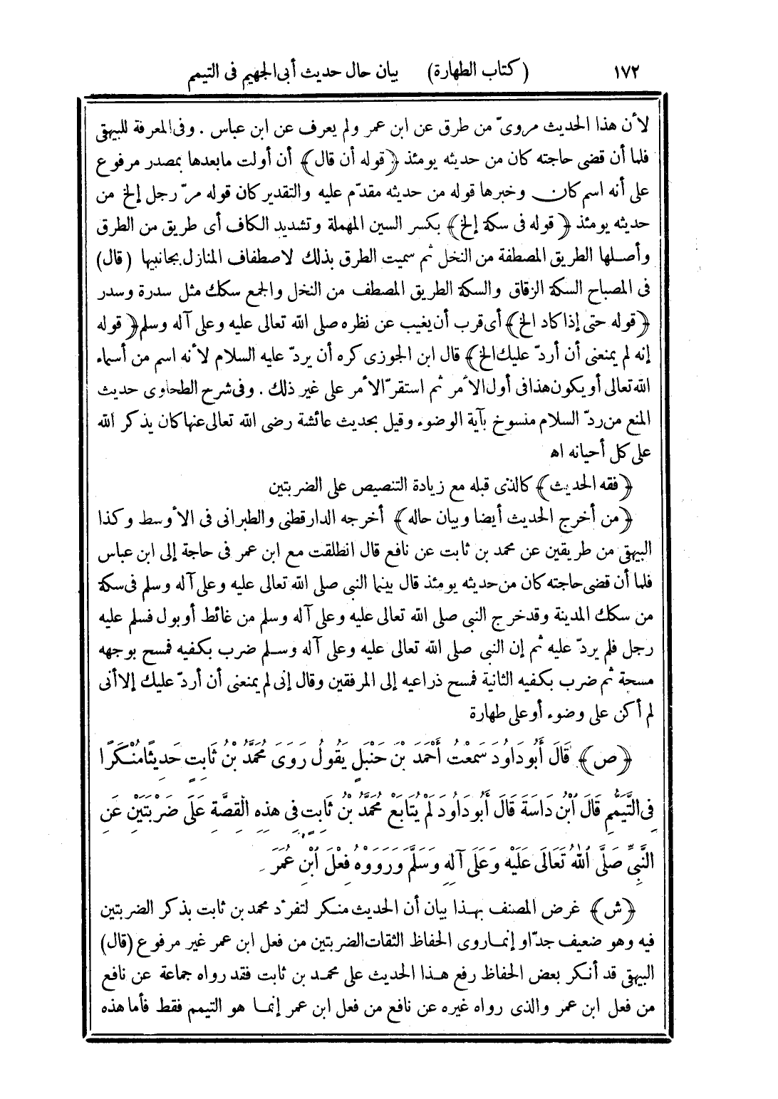 (من أخرج الحديث أيضا وبيان حاله) أخرجه الدارقطنى والطبرانى في الأوسط وكذا البيهقى من طريقين عن محمد بن ثابت عن نافع قال انطلقت مع ابن عمر في حاجة إلى ابن عباس فلما أن قضى حاجته كان من حديثه يومئذ قال بينما النبى صلى الله تعالى عليه وعلى آله وسلم في سكة من سكك المدينة وقد خرج النبى صلى الله تعالى عليه وعلى آله وسلم من غائط أو بول فسلم عليه رجل فلم يردّ عليه ثم إن النبي صلى الله تعالى عليه وعلى آله وسلم ضرب بكفيه فمسح بوجهه مسحة ثم ضرب بكفيه الثانية فمسح ذراعيه إلى المرفقين وقال إني لم يمنعنى أن أردّ عليك إلا أنى لم أكن على وضوء أو على طهارة