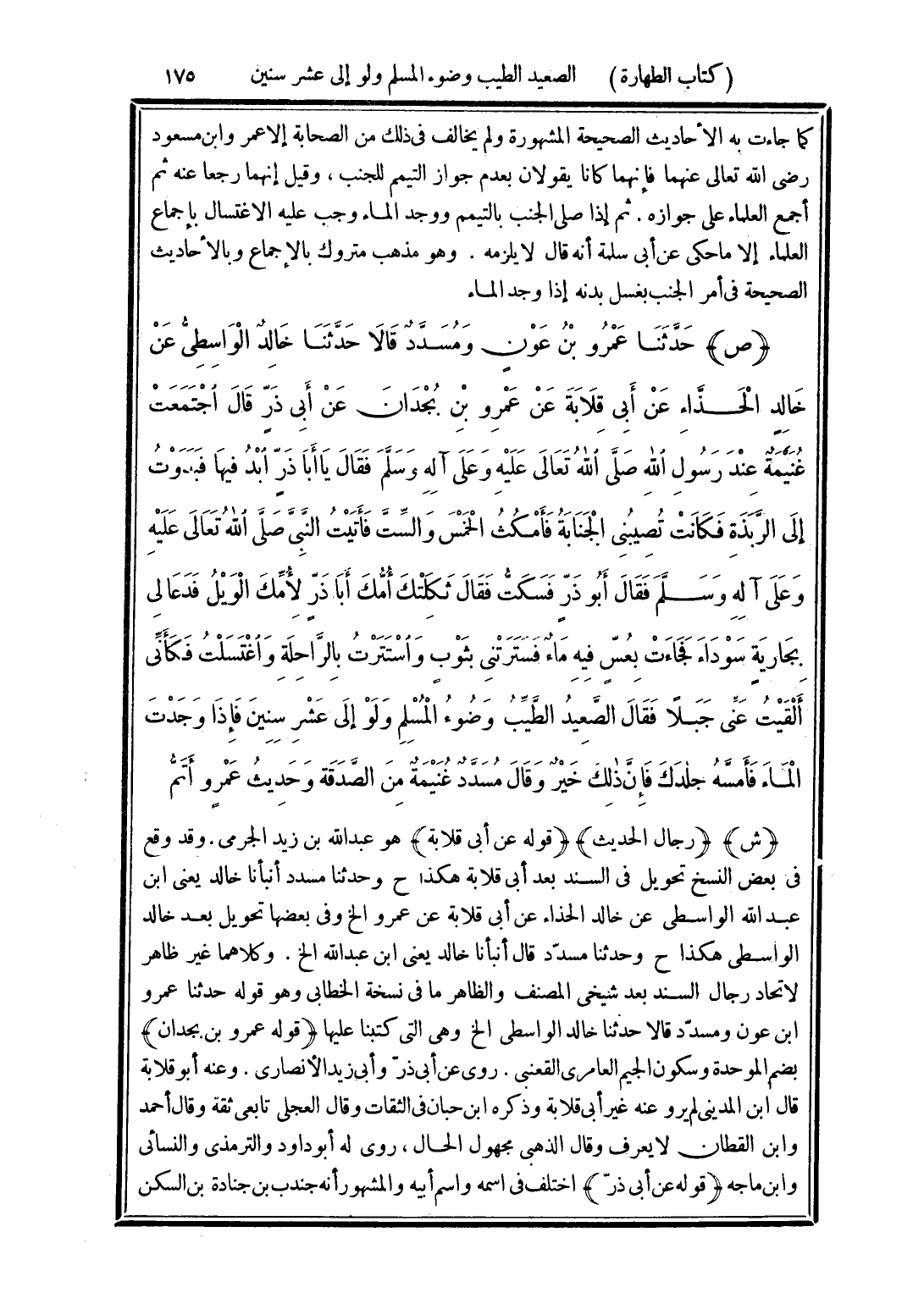 (ص) حَدَّثَنَا عَمْرُو بْنُ عَوْنٍ، وَمُسَدَّدٌ قَالَا حَدَّثنَا خَالِدٌ الْوَاسِطِيُّ، عَنْ خَالِدٍ الْحَذَّاءِ عَنْ أَبِي قِلَابَةَ، عَنْ عَمْرِو بْنِ بُجْدَانَ، عَنْ أَبِي ذَرٍّ قَالَ: اجْتَمَعَتْ غُنَيْمَةٌ عِنْدَ رَسُولِ اللَّهِ صَلَّى اللهُ تَعَالَى عَلَيْهِ وَعَلَى آلِهِ وسَلَّمَ فَقَالَ: «يَا أَبَا ذَرٍّ ابْدُ فِيهَا». فَبَدَوْتُ إِلَى الرَّبَذَةِ فَكَانَتْ تُصِيبُنِي الْجَنَابَةُ فَأَمْكُثُ الْخَمْسَ وَالسِّتَّ، فَأَتَيْتُ النَّبِيَّ صَلَّى اللهُ تَعَالَى عَلَيْهِ وَسَلَّمَ فَقَالَ: «أبُو ذَرٍّ». فَسَكَتُّ فَقَالَ: «ثَكِلَتْكَ أُمُّكَ أَبَا ذَرٍّ لِأُمِّكَ الْوَيْلُ». فَدَعَا لِي بِجَارِيَةٍ سَوْدَاءَ فَجَاءَتْ بِعُسٍّ فِيهِ مَاءٌ فَسَتَرَتْنِي بِثَوْبٍ وَاسْتَتَرْتُ بِالرَّاحِلَةِ، وَاغْتَسَلْتُ فَكَأَنِّي أَلْقَيْتُ عَنِّي جَبَلًا فَقَالَ «الصَّعِيدُ الطَّيِّبُ وَضُوءُ الْمُسْلِمِ وَلَوْ إِلَى عَشْرِ سِنِينَ، فَإِذَا وَجَدْتَ الْمَاءَ فَأَمِسَّهُ جِلْدَكَ فَإِنَّ ذَلِكَ خَيْرٌ» وَقَالَ: مُسَدَّدٌ: «غُنَيْمَةٌ مِنَ الصَّدَقَةِ» «وَحَدِيثُ عَمْرٍو أَتَمُّ»