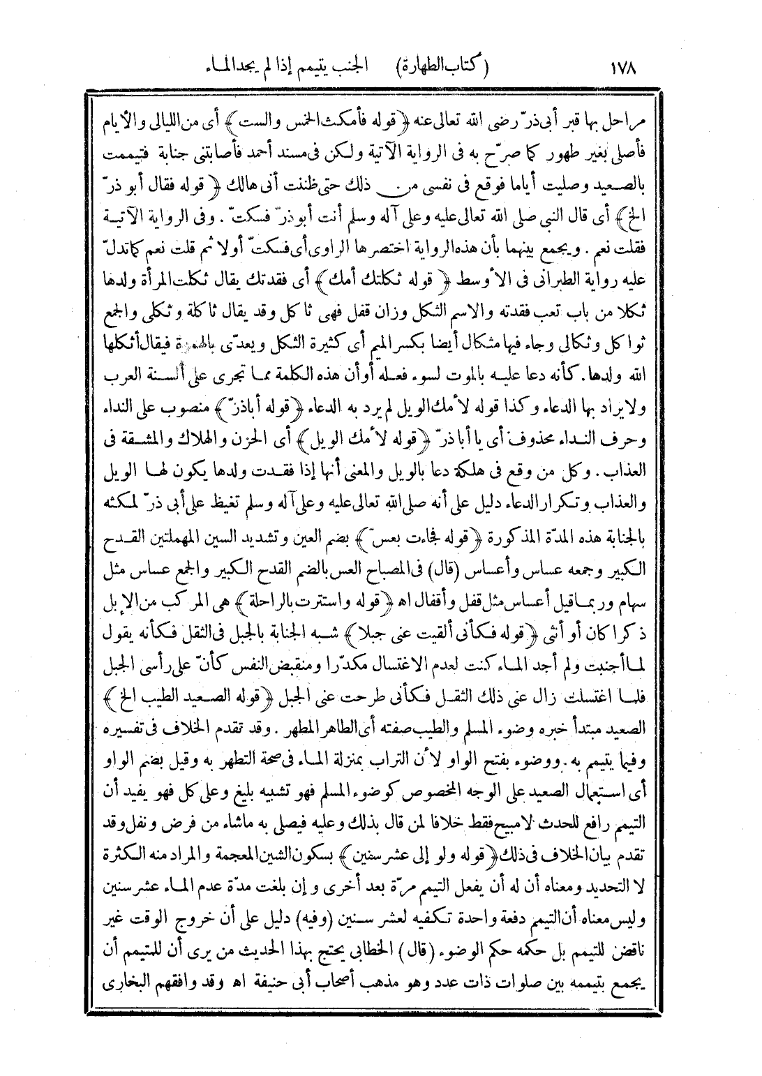 (قوله لأمك الويل) أى الحزن والهلاك والمشقة في العذاب. وكل من وقع في هلكة دعا بالويل والمعنى أنها إذا فقدت ولدها يكون لها الويل والعذاب وتكرار الدعاء دليل على أنه صلى الله تعالى عليه وعلى آله وسلم تغيظ على أبى ذرّ لمكثه بالجنابة هذه المدّة المذكورة