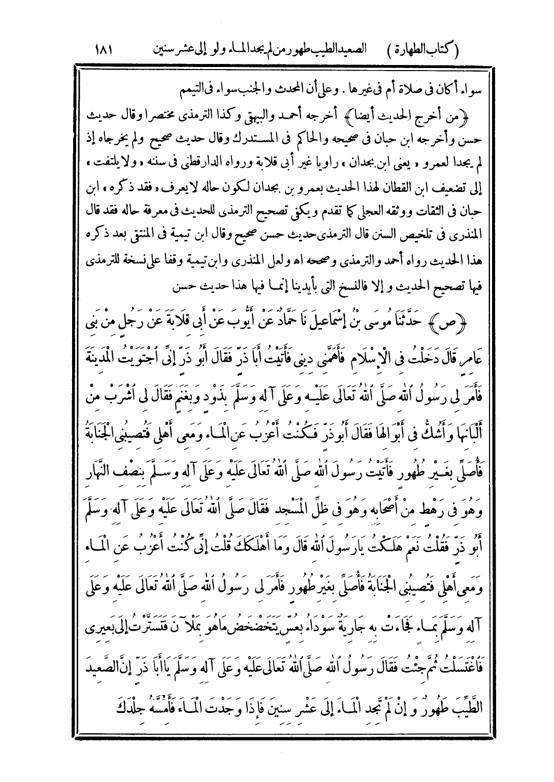 (من أخرج الحديث أيضا) أخرجه أحمد والبيهقى وكذا الترمذى مختصرا وقال حديث حسن وأخرجه ابن حبان في صحيحه والحاكم في المستدرك وقال حديث صحيح ولم يخرجاه إذ لم يجدا لعمرو "يعنى ابن بجدان" راويا غير أبى قلابة ورواه الدارقطني في سننه "ولا يلتفت" إلى تضعيف ابن القطان لهذا الحديث بعمرو بن بجدان لكون حاله لا يعرف "فقد ذكره" ابن حبان في الثقات ووثقه العجلى كما تقدم ويكفى تصحيح الترمذى للحديث في معرفة حاله فقد قال المنذرى في تلخيص السنن قال الترمذى حديث حسن صحيح وقال ابن تيمية في المنتقى بعد ذكره هذا الحديث رواه أحمد والترمذى وصححه اهـ ولعل المنذرى وابن تيمية وقفا على نسخة للترمذى فيها تصحيح الحديث وإلا فالنسخ التي بأيدينا إنما فيها هذا حديث حسن