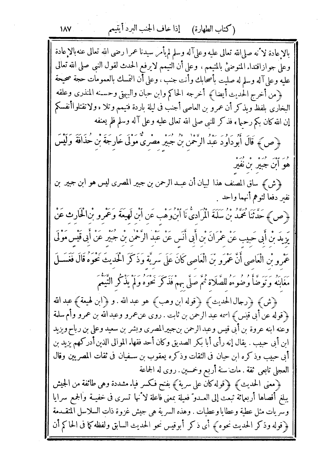 (ص) حَدَّثَنَا مُحَمَّدُ بْنُ سَلَمَةَ الْمُرَادِيُّ، نَا ابْنُ وَهْبٍ، عَنِ ابْنِ لَهِيعَةَ، وَعَمْرِو بْنِ الْحَارِثِ، عَنْ يَزِيدَ بْنِ أَبِي حَبِيبٍ، عَنْ عِمْرَانَ بْنِ أَبِي أَنَسٍ، عَنْ عَبْدِ الرَّحْمَنِ بْنِ جُبَيْرٍ، عَنْ أَبِي قَيْسٍ مَوْلَى عَمْرِو بْنِ الْعَاصي، أَنَّ عَمْرَو بْنَ الْعَاصي كَانَ عَلَى سَرِيَّةٍ، وَذَكَرَ الْحَدِيثَ نَحْوَهُ. قَالَ: «فَغَسَلَ مَغَابِنَهُ وَتَوَضَّأَ وُضُوءَهُ لِلصَّلَاةِ، ثُمَّ صَلَّى بِهِمْ»، فَذَكَرَ نَحْوَهُ وَلَمْ يَذْكُرِ التَّيَمُّمَ.