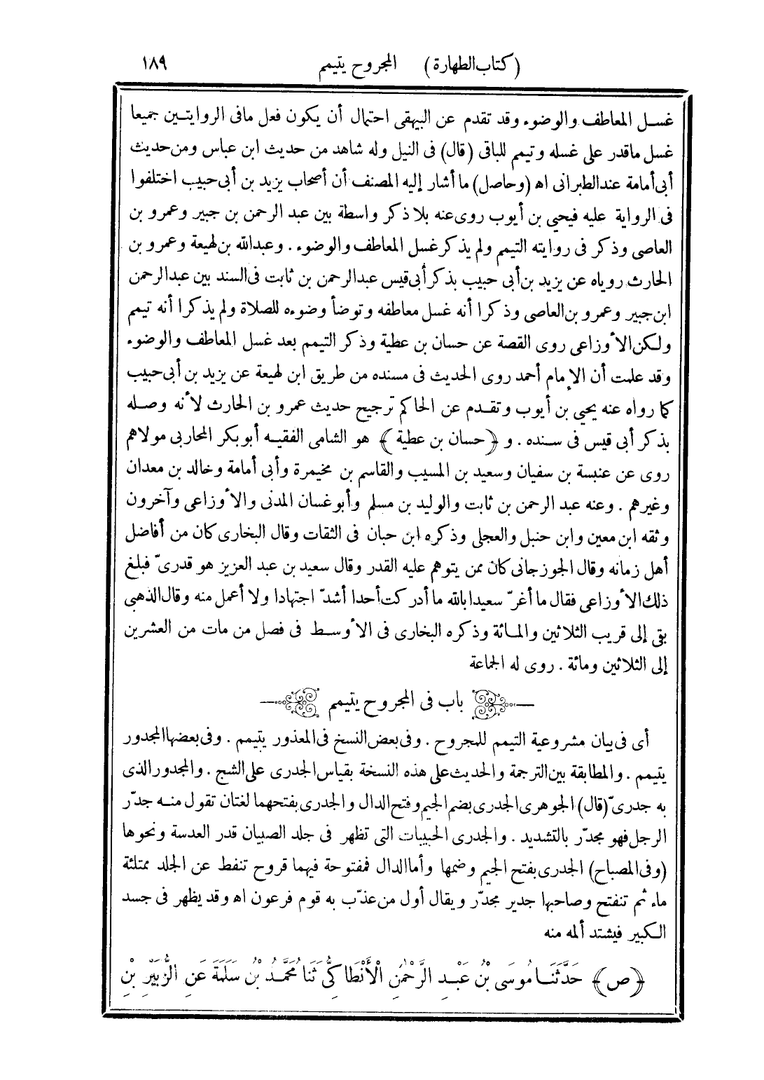 غسل المعاطف والوضوء وقد تقدم عن البيهقى احتمال أن يكون فعل ما في الروايتين جميعا غسل ما قدر على غسله وتيمم للباقى (قال) في النيل وله شاهد من حديث ابن عباس ومن حديث أبى أمامة عند الطبرانى اهـ (وحاصل) ما أشار إليه المصنف أن أصحاب يزيد بن أبى حبيب اختلفوا في الرواية عليه فيحيى بن أيوب روى عنه بلا ذكر واسطة بين عبد الرحمن بن جبير وعمرو بن العاصى وذكر في روايته التيمم ولم يذكر غسل المعاطف والوضوء. وعبد الله بن لهيعة وعمرو بن الحارث روياه عن يزيد بن أبى حبيب بذكر أبى قيس عبد الرحمن بن ثابت في السند بين عبد الرحمن ابن جبير وعمرو بن العاصى وذكرا أنه غسل معاطفه وتوضأ وضوءه للصلاة ولم يذكرا أنه تيمم ولكن الأوزاعى روى القصة عن حسان بن عطية وذكر التيمم بعد غسلل المعاطف والوضوء وقد علمت أن الإمام أحمد روى الحديث في مسنده من طريق ابن لهيعة عن يزيد بن أبى حبيب كما رواه عنه يحيى بن أيوب وتقدم عن الحاكم ترجيح حديث عمرو بن الحارث لأنه وصله بذكر أبى قيس في سنده. و (حسان بن عطية) هو الشامى الفقيه أبو بكر المحاربى مولاهم روى عن عنبسة بن سفيان وسعيد بن المسيب والقاسم بن مخيمرة وأبى أمامة وخالد بن معدان وغيرهم. وعنه عبد الرحمن بن ثابت والوليد بن مسلم وأبو غسان المدنى والأوزاعى وآخرون وثقه ابن معين وابن حنبل والعجلى وذكره ابن حبان في الثقات وقال البخارى كان من أفاضل أهل زمانه وقال الجوزجانى كان ممن يتوهم عليه القدر وقال سعيد بن عبد العزيز هو قدريّ فبلغ ذلك الأوزاعى فقال ما أغرّ سعيدا بالله ما أدركت أحدا أشدّ اجتهادا ولا أعمل منه وقال الذهبى بقى إلى قريب الثلاثين والمائة وذكره البخارى في الأوسط في فصل من مات من العشرين إلى الثلاثين ومائة. روى له الجماعة