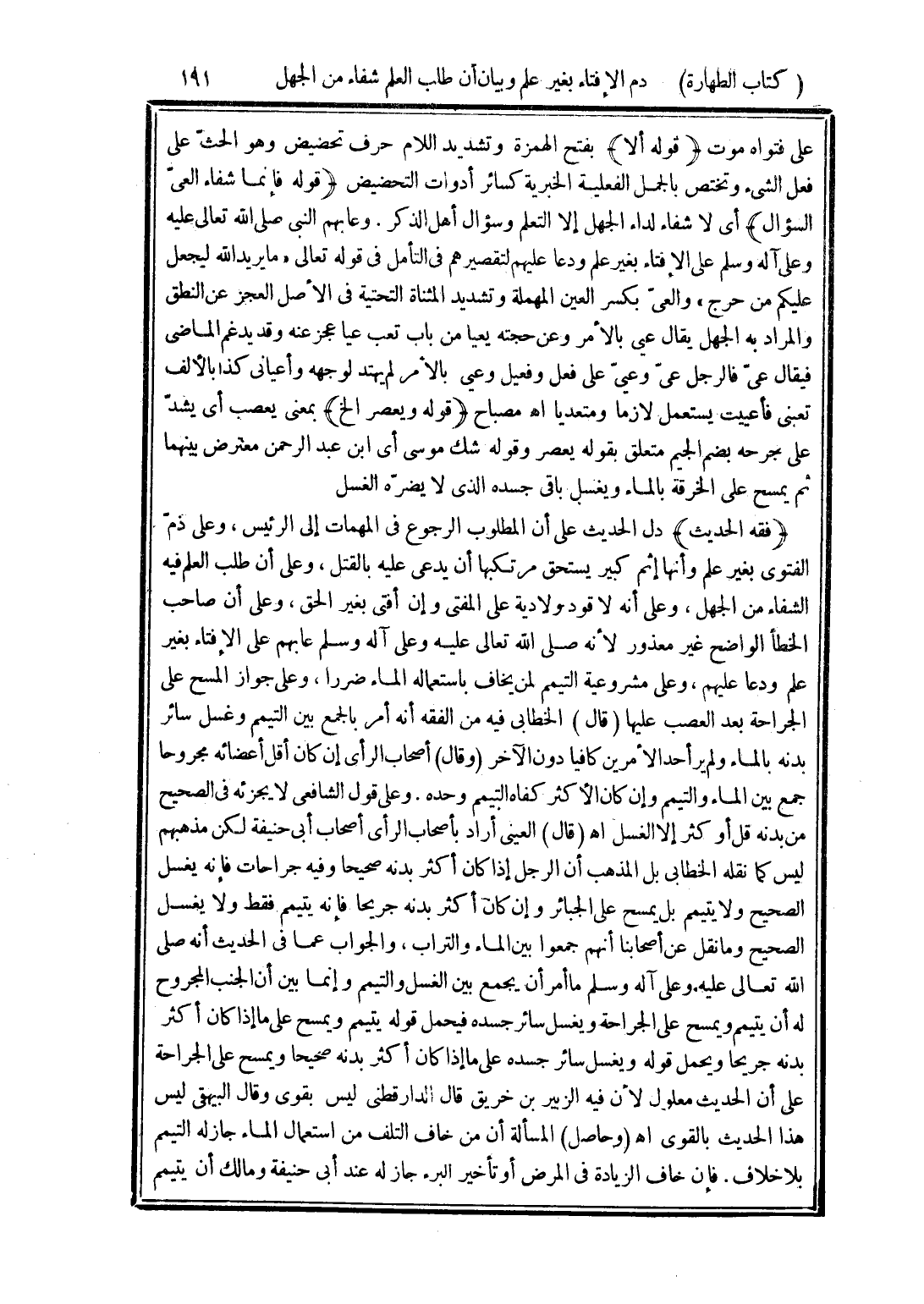 (قوله فإنما شفاء العىّ السؤال) أى لا شفاء لداء الجهل إلا التعلم وسؤال أهل الذكر. وعابهم النبي صلى الله تعالى عليه وعلى آله وسلم على الإفتاء بغير علم ودعا عليهم لتقصيرهم في التأمل في قوله تعالى "ما يريد الله ليجعل عليكم من حرج" والعيّ بكسر العين المهملة وتشديد المثناة التحتية في الأصل العجز عن النطق والمراد به الجهل يقال عييّ بالأمر وعن حجته يعيا من باب تعب عيا عجز عنه وقد يدغم الماضى فيقال عيّ فالرجل عيّ وعييّ على فعل وفعيل وعيى بالأمر لم يهتد لوجهه وأعياني كذا بالألف تعبنى فأعييت يستعمل لازما ومتعديا اهـ مصباح