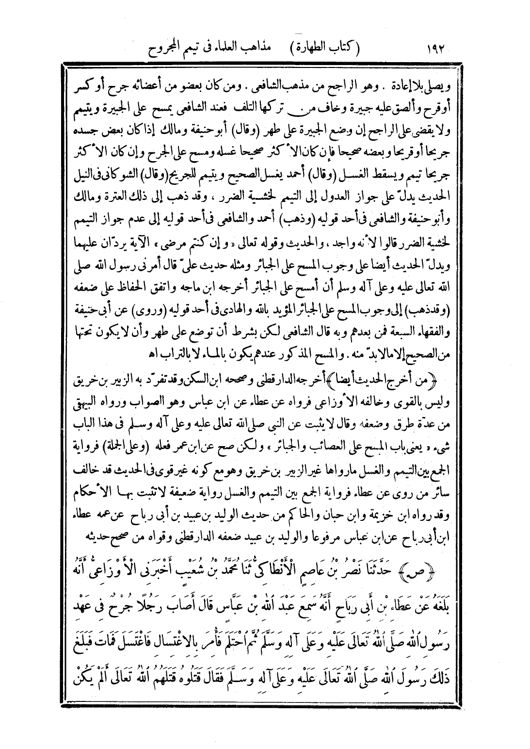 ويصلى بلا إعادة. وهو الراجح من مذهب الشافعى. ومن كان بعضو من أعضائه جرح أو كسر أو قرح وألصق عليه جبيرة وخاف من تركها التلف فعند الشافعى يمسح على الجبيرة ويتيمم ولا يقضي على الراجح إن وضع الجبيرة على طهر (وقال) أبو حنيفة ومالك إذا كان بعض جسده جريحا أو قريحا وبعضه صحيحا فإن كان الأكثر صحيحا غسله ومسح على الجرح وإن كان الأكثر جريحا تيمم ويسقط الغسل (وقال) أحمد يغسل الصحيح ويتيمم للجريح (وقال) الشوكانى في النيل الحديث يدلّ على جواز العدول إلى التيمم لخشية الضرر، وقد ذهب إلى ذلك العترة ومالك وأبو حنيفة والشافعى في أحد قوليه (وذهب) أحمد والشافعى في أحد قوليه إلى عدم جواز التيمم لخشية الضرر قالوا لأنه واجد، والحديث وقوله تعالى "وإن كنتم مرضى" الآية يردّان عليهما ويدلّ الحديث أيضا على وجوب المسح على الجبائر ومثله حديث علىّ قال أمرني رسول الله صلى الله تعالى عليه وعلى آله وسلم أن أمسح على الجبائر أخرجه ابن ماجه واتفق الحفاظ على ضعفه (وقد ذهب) إلى وجوب المسح على الجبائر المؤيد بالله والهادى في أحد قوليه (وروى) عن أبى حنيفة والفقهاء السبعة فمن بعدهم وبه قال الشافعى لكن بشرط أن توضع على طهر وأن لا يكون تحتها من الصحيح إلا ما لا بدّ منه. والمسح المذكور عندهم يكون بالماء لا بالتراب اهـ