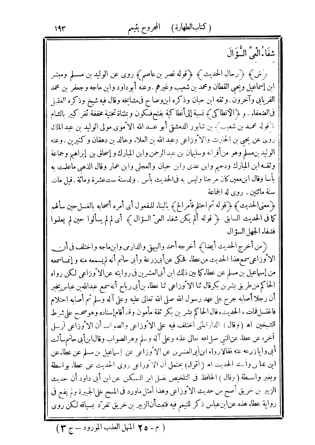 (من أخرج الحديث أيضا) أخرجه أحمد والبيهقى والدارامي وابن ماجه اختلف في أن الأوزاعي سمع هذا الحديث من عطاء فحكى عن أبى زرعة وأبى حاتم أنه لم يسمعه منه وإنما سمعه من إسماعيل بن مسلم عن عطاء كما بين ذلك ابن أبى العشرين في روايته عن الأوزاعى لكن رواه الحاكم من طريق بشر بن بكر قال ثنا الأوزاعي ثنا عطاء بن أبى رباح أنه سمع عبد الله بن عباس يخبر أن رجلا أصابه جرح على عهد رسول الله صلى الله تعالى عليه وعلى آله وسلم ثم أصابه احتلام فاغتسل فمات "الحديث" قال الحاكم بشر بن بكر ثقة مأمون وقد أقام إسناده وهو صحيح على شرط الشيخين اهـ (وقال) الدارقطني اختلف فيه على الأوزاعي والصواب أن الأوزاعي أرسل آخره عن عطاء عن النبي صلى الله تعالى عليه على آله وسلم وهو الصواب وقال ابن أبى حاتم سألت أبى وأبا زرعة عنه فقالا رواه ابن أبي العشرين عن الأوزاعي عن إسماعيل بن مسلم عن عطاء عن ابن عباس وأسند الحديث اهـ (أقول) يحتمل أن الأوزاعى روى الحديث عن عطاء بواسطة وبغير واسطة (وقال) الحافظ في التلخيص نقل ابن السكن عن ابن أبى داود أن حديث الزبير بن خريق أصح من حديث الأوزاعي وهذا أمثل ما ورد في المسح على الجبيرة ولم يقع في رواية عطاء هذه عن ابن عباس ذكر للتيمم فيه فثبت أن الزبير بن خريق تفرّد بسياقه لكن روى
