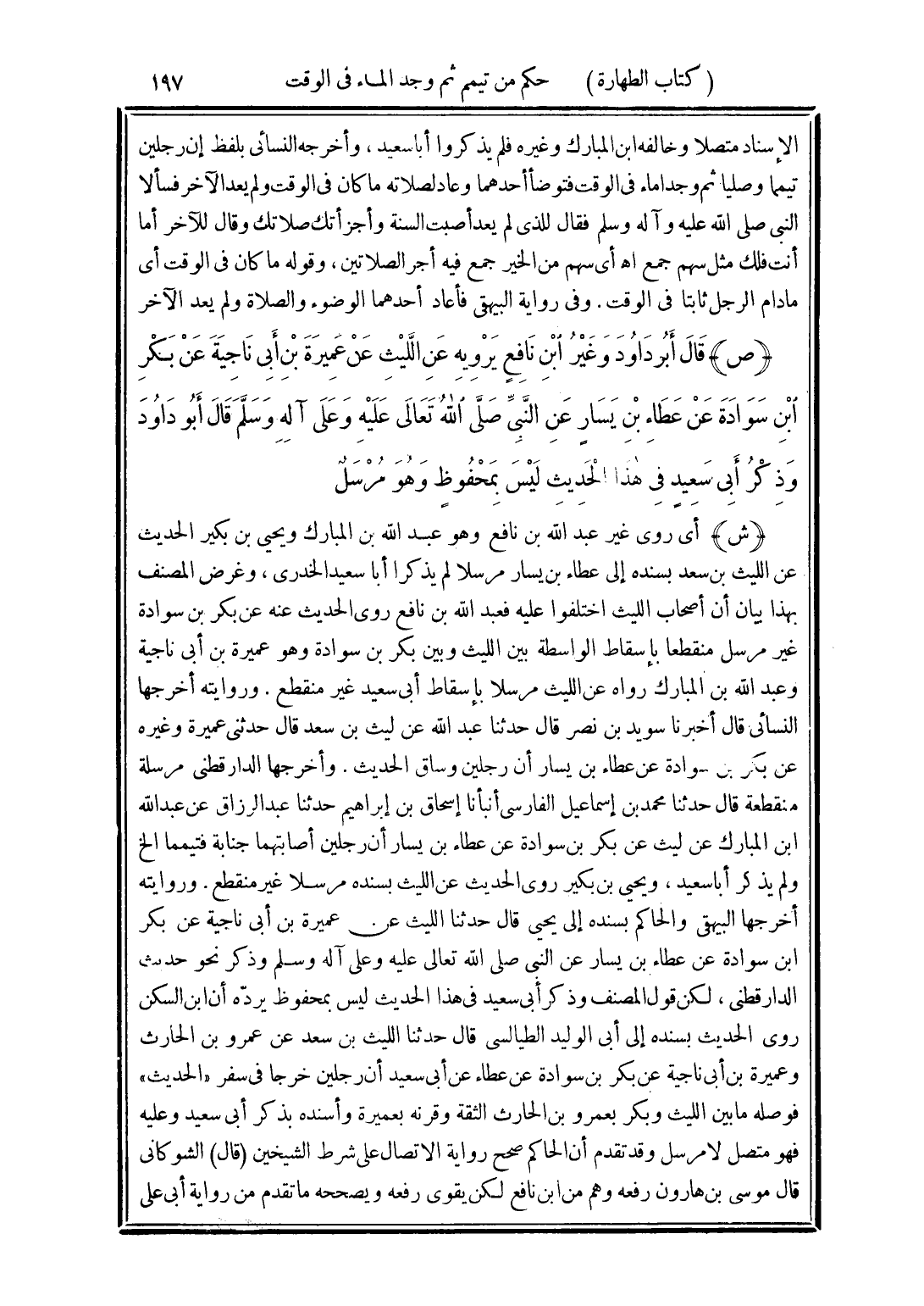 الإسناد متصلا وخالفه ابن المبارك وغيره فلم يذكروا أبا سعيد، وأخرجه النسائي بلفظ إن رجلين تيمما وصليا ثم وجدا ماء في الوقت فتوضأ أحدهما وعاد لصلاته ما كان في الوقت ولم يعد الآخر فسألا النبى صلى الله عليه وآله وسلم فقال للذى لم يعد أصبت السنة وأجزأتك صلاتك وقال للآخر أما أنت فلك مثل سهم جمع اهـ أى سهم من الخير جمع يه أجر الصلاتين، وقوله ما كان في الوقت أى ما دام الرجل ثابتا في الوقت. وفي رواية البيهقى فأعاد أحدهما الوضوء والصلاة ولم يعد الآخر