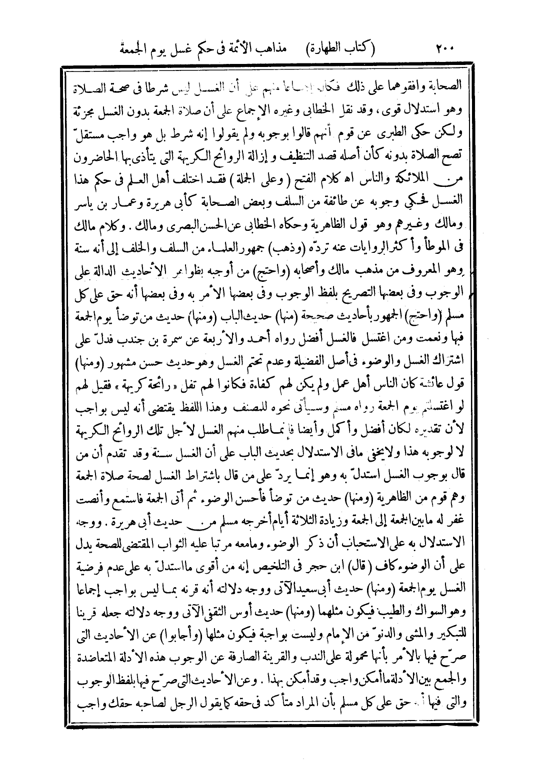 الصحابة وافقوهما على ذلك فكان إجماعا منهم على أن الغسل ليس شرطا في صحة الصلاة وهو استدلال قوى، وقد نقل الخطابي وغيره الإجماع على أن صلاة الجمعة بدون الغسل مجزئة ولكن حكى الطبرى عن قوم أنهم قالوا بوجوبه ولم يقولوا إنه شرط، بل هو واجب مستقلّ تصح الصلاة بدونه كأن أصله قصد التنظيف وإزالة الروايح الكريهة التي يتأذى بها الحاضرون من الملائكة والناس اهـ كلام الفتح (وعلى الجملة) فقد اختلف أهل العلم في حكم هذا الغسل فحكى وجوبه عن طائفة من السلف وبعض الصحابة كأبى هريرة وعمار بن ياسر ومالك وغيرهم وهو قول الظاهرية وحكاه الخطابى عن الحسن البصرى ومالك. وكلام مالك في الموطأ وأكثر الروايات عنه تردّه (وذهب) جمهور العلماء من السلف والخلف إلى أنه سنة وهو المعروف من مذهب مالك وأصحابه (واحتج) من أوجبه بظواهر الأحاديث الدالة على الوجوب وفى بعضها التصريح بلفظ الوجوب وفى بعضها الأمر به وفى بعضها أنه حق على كل مسلم (واحتج) الجمهور بأحاديث صحيحة (منها) حديث الباب (ومنها) حديث من توضأ يوم الجمعة فبها ونعمت ومن اغتسل فالغسل أفضل رواه أحمد والأربعة عن سمرة بن جندب فدلّ على اشتراك الغسل والوضوء في أصل الفضيلة وعدم تحتم الغسل وهو حديث حسن مشهور (ومنها) قول عائشة كان الناس أهل عمل ولم يكن لهم كفاءة فكانوا لهم تفل "رائحة كريهة" فقيل لهم لو اغتسلتم يوم الجمعة رواه مسلم وسيأتى نحوه للمصنف وهذا اللفظ يقتضى أنه ليس بواجب لأن تقديره لكان أفضل وأكمل وأيضا فإنما طلب منهم الغسل لأجل تلك الروايح الكريهة لا لوجوبه هذا ولا يخفى ما في الاستدلال بحديث الباب على أن الغسل سنة وقد تقدم أن من قال بوجوب الغسل استدلّ به وهو إنما يردّ على من قال باشتراط الغسل لصحة صلاة الجمعة وهم قوم من الظاهرية (ومنها) حديث من توضأ فأحسن الوضوء ثم أتى الجمعة فاستمع وأنصت غفر له ما بين الجمعة إلى الجمعة وزيادة الثلاثة أيام أخرجه مسلم من حديث أبى هريرة. ووجه الاستدلال به على الاستحباب أن ذكر الوضوء وما معه مرتبا عليه الثواب المقتضى للصحة يدل على أن الوضوء كاف (قال) ابن حجر في التلخيص إنه من أقوى ما استدلّ به على عدم فرضية الغسل يوم الجمعة (ومنها) حديث أبى سعيد الآتى ووجه دلالته أنه قرنه بما ليس بواجب إجماعا وهو السواك والطيب. فيكون مثلهما (ومنها) حديث أوس الثقفى الآتى ووجه دلالته جعله قرينا للتبكير والمشى والدنوّ من الإمام وليست بواجبة فيكون مثلها (وأجابوا) عن الأحاديث التى صرّح فيها بالأمر بأنها محمولة على الندب والقرينة الصارفة عن الوجوب هذه الأدلة المتعاضدة والجمع بين الأدلة ما أمكن واجب وقد أمكن بهذا. وعن الأحاديث التى صرّح فيها لفظ الوجوب والتي فيها أنه حق على كل مسلم بأن المراد متأكد في حقه كما يقول الرجل لصاحبه حقك واجب