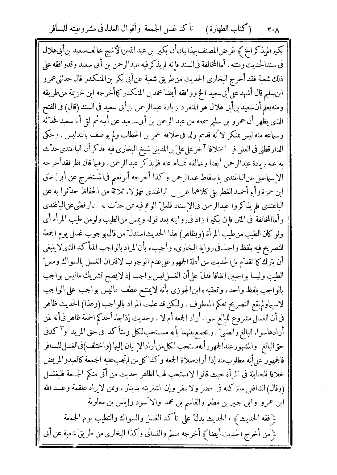 بكيرًا لم يذكر الخ) غرض المصنف بهذا بيان أن بكير بن عبد الله بن الأشج خالف سعيد بن أبى هلال في سند الحديث ومتنه. أما المخالفة في السند فإنه لم يذكر فيه عبد الرحمن بن أبى سعيد وقد وافقه على ذلك شعبة فقد أخرج البخارى الحديث من طريق شعبة عن أبى بكر بن المنكدر قال حدثني عمرو ابن سليم قال أشهد على أبى سعيد الخ ووافقه أيضا محمد بن المنكدر كما أخرجه ابن خزيمة من طريقه ومنه يعلم أن سعيد بن أبى هلال هو المنفرد بزيادة عبد الرحمن بن أبى سعيد في السند (قال) في الفتح الذى يظهر أن عمرو بن سليم سمعه من عبد الرحمن بن أبى سعيد عن أبيه لقى أبا سعيد فحدّثه وسماعه منه ليس بمنكر لأنه قديم ولد في خلافة عمر بن الخطاب ولم يوصف بالتدليس، وحكى الدارقطنى في العلل فيه اختلافا آخر على عليّ بن المديني شيخ البخارى فيه فذكر إن الباغندى حدّث به عنه بزيادة عبد الرحمن أيضا وخالفه وتمام عنه فلم بذكر عبد الرحمن. وفيما قال نظر فقد أخرجه الإسماعيلى عن الباغندى بإسقاط عبد الرحمن وكذا أخرجه أبو نعيم في المستخرج عن أبى إسحاق ابن حمزة وأبو أحمد الغطريفي كلاهما عن الباغندى فهؤلاء ثلاثة من الحفاظ حدّثوا به عن الباغندى فلم يذكروا عبد الرحمن في الإسناد فلعلّ الوهم فيه ممن حدّث به الدارقطنى عن الباغندى وأما المخالفة في المتن فإن بكيرا زاد في روايته بعد قوله ويمس من الطيب ولو من طيب المرأة أى ولو كان الطيب من طيب المرأة (وبظاهر) هذا الحديث استدلّ من قال بوجوب غسل يوم الجمعة للتصريح فيه بلفظ واجب في رواية البخارى "وأجيب" بأن المراد بالواجب المتأكد الذى لا ينبغى أن يترك كما تقدّم بل الحديث من أدلة الجمهور على عدم الوجوب لاقتران الغسل بالسواك ومسّ الطيب وليسا بواجبين اتفاقا فدّل على أن الغسل ليس بواجب إذ لا يصح تشريك ما ليس بواجب بالواجب بلفظ واحد "وتعقبه" ابن الجوزى بأنه لا يمتنع عطف ما ليس بواجب على الواجب لا سيما ولم يقع التصريح بحكم المعطوف. ولكن قد علمت المراد بالواجب (وهذا) الحديث ظاهر في أن الغسل مشروع للبالغ سواء أراد الجمعة أم لا. وحديث إذا جاء أحدكم الجمعة ظاهر في أنه لمن أرادها سواء البالغ والصبيّ. ويجمع بينهما بأنه مستحب لكل ومتأكد في حق المريد وآكد في حق البالغ والمشهور عند الجمهور أنه مستحب لكل من أراد الإتيان ليها (واختلف) في الغسل للمسافر فالجمهور على أنه مطلوب منه إذا أراد صلاة الجمعة وكذا كل من لم تجب عليه الجمعة كالعبد والمريض خلافا للحنابلة في المرأة حيث قالوا لا يستحب لها لظاهر حديث من أتى منكم الجمعة فليغتسل (وقال) الشافعي ما تركته في حضر ولا سفر وإن اشتريته بدينار، وممن لا يراه علقمة وعبد الله ابن عمرو وابن جبير بن مطعم والقاسم بن محمد والأسود وإياس بن معاوية