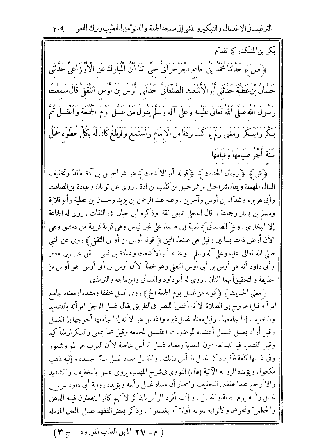 (ص) حَدَّثَنَا مُحَمَّدُ بْنُ حَاتِمٍ الْجَرْجَرَائِيُّ حِبِّي، ثَنَا ابْنُ الْمُبَارَكِ، عَنِ الْأَوْزَاعِيِّ، حَدَّثَنِي حَسَّانُ بْنُ عَطِيَّةَ، حَدَّثَنِي أَبُو الْأَشْعَثِ الصَّنْعَانِيُّ، حَدَّثَنِي أَوْسُ بْنُ أَوْسٍ الثَّقَفِيُّ قال سَمِعْتُ رَسُولَ اللَّهِ صَلَّى اللهُ تَعَالَى عَلَيْهِ وَعَلَى آلِهِ وسَلَّمَ يَقُولُ: «مَنْ غَسَّلَ يَوْمَ الْجُمُعَةِ وَاغْتَسَلَ، ثُمَّ بَكَّرَ وَابْتَكَرَ، وَمَشَى وَلَمْ يَرْكَبْ، وَدَنَا مِنَ الْإِمَامِ وَاسْتَمَعَ وَلَمْ يَلْغُ كَانَ لَهُ بِكُلِّ خُطْوَةٍ عَمَلُ سَنَةٍ أَجْرُ صِيَامِهَا وَقِيَامِهَا».