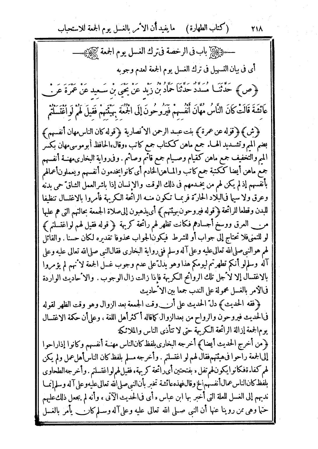 (من أخرج الحديث أيضا) أخرجه البخارى بلفظ كان الناس مهنة أنفسهم وكانوا إذا راحوا إلى الجمعة راحوا في هيئتهم فقال لهم لو اغتسلتم. وأخرجه مسلم بلفظ كان الناس أهل عمل ولم يكن لهم كفاءة فكانوا يكون لهم تفل "بفتحتين أى رائحة كريهة" فقيل لهم لو اغتسلتم. وأخرجه الطحاوى بلفظ كان الناس عمال أنفسهم الخ وقال فهذه عائشة تخبر بأن النبي صلى الله تعالى عليه وعلى آله وسلم إنما ندبهم إلى الغسل للعلة التي أخبر بها ابن عباس "أى في الحديث الآتى" وأنه لم يجعل ذلك عليهم حتما وهى ممن روينا عنها أن النبى صلى الله تعالى عليه وعلى آله وسلم كان يأمر بالغسل