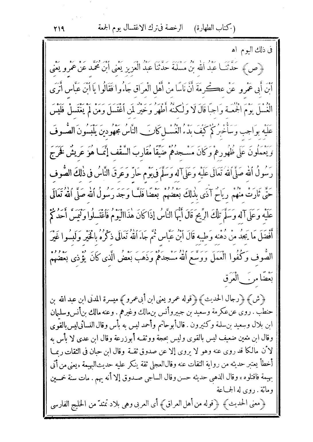 (ص) حَدَّثَنَا عَبْدُ اللَّهِ بْنُ مَسْلَمَةَ، حَدَّثَنَا عَبْدُ الْعَزِيزِ يَعْنِي ابْنَ مُحَمَّدٍ، عَنْ عَمْرِو يعني ابْنِ أَبِي عَمْرٍو، عَنْ عِكْرِمَةَ، أَنَّ نَاسًا مِنْ أَهْلِ الْعِرَاقِ جَاءُوا فَقَالُوا: يَا ابْنَ عَبَّاسٍ أَتَرَى الْغُسْلَ يَوْمَ الْجُمُعَةِ وَاجِبًا؟ قَالَ: لَا، وَلَكِنَّهُ أَطْهَرُ، وَخَيْرٌ لِمَنِ اغْتَسَلَ، وَمَنْ لَمْ يَغْتَسِلْ فَلَيْسَ عَلَيْهِ بِوَاجِبٍ، وَسَأُخْبِرُكُمْ كَيْفَ بَدْءُ الْغُسْلِ كَانَ النَّاسُ مَجْهُودِينَ يَلْبَسُونَ الصُّوفَ وَيَعْمَلُونَ عَلَى ظُهُورِهِمْ، وَكَانَ مَسْجِدُهُمْ ضَيِّقًا مُقَارِبَ السَّقْفِ -إِنَّمَا هُوَ عَرِيشٌ- فَخَرَجَ رَسُولُ اللَّهِ صَلَّى اللهُ تَعَالَى عَلَيْهِ وَعَلَى آلِهِ وسَلَّمَ فِي يَوْمٍ حَارٍّ وَعَرِقَ النَّاسُ فِي ذَلِكَ الصُّوفِ حَتَّى ثَارَتْ مِنْهُمْ رِيَاحٌ آذَى بِذَلِكَ بَعْضُهُمْ بَعْضًا، فَلَمَّا وَجَدَ رَسُولُ اللَّهِ صَلَّى اللهُ تَعَالَى عَلَيْهِ وَعَلَى آلِهِ وَسَلَّمَ تِلْكَ الرِّيحَ قَالَ: «أَيُّهَا النَّاسُ إِذَا كَانَ هَذَا الْيَوْمَ فَاغْتَسِلُوا، وَلْيَمَسَّ أَحَدُكُمْ أَفْضَلَ مَا يَجِدُ مِنْ دُهْنِهِ وَطِيبِهِ» قَالَ ابْنُ عَبَّاسٍ: ثُمَّ جَاءَ اللَّهُ بِالْخَيْرِ وَلَبِسُوا غَيْرَ الصُّوفِ، وَكُفُوا الْعَمَلَ وَوُسِّعَ مَسْجِدُهُمْ، وَذَهَبَ بَعْضُ الَّذِي كَانَ يُؤْذِي بَعْضُهُمْ بَعْضًا مِنَ الْعَرَقِ
