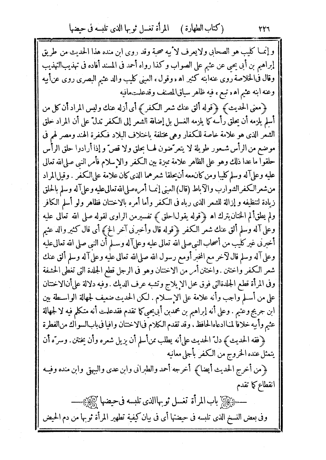(فقه الحديث) دلّ الحديث على أنه يطلب ممن أسلم أن يزيل شعره وأن يختتن. وسرّه أن يتمثل عنده الخروج من الكفر بأجلى معانيه