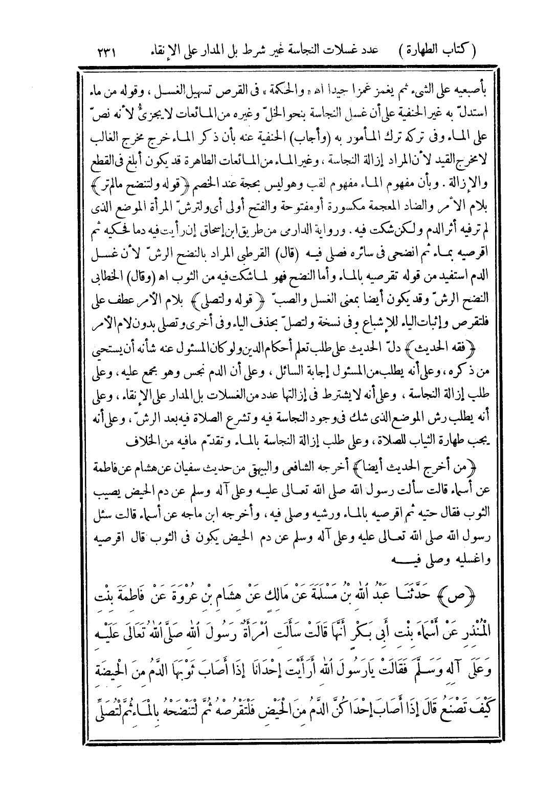 (فقه الحديث) دلّ الحديث على طلب تعلم أحكام الدين ولو كان المسئول عنه شأنه أن يستحيى من ذكره، وعلى أنه يطلب من المسئول إجابة السائل، وعلى أن الدم نجس وهو مجمع عليه، وعلى طلب إزالة النجاسة، وعلى أنه لا يشترط في إزالتها عدد من الغسلات بل المدار على الإنقاء، وعلى أنه يطلب رش الموضع الذى شك في وجود النجاسة فيه وتشرع الصلاة فيه بعد الرشّ، وعلى أنه يجب طهارة الثياب للصلاة، وعلى طلب إزالة النجاسة بالماء وتقدّم ما فيه من الخلاف