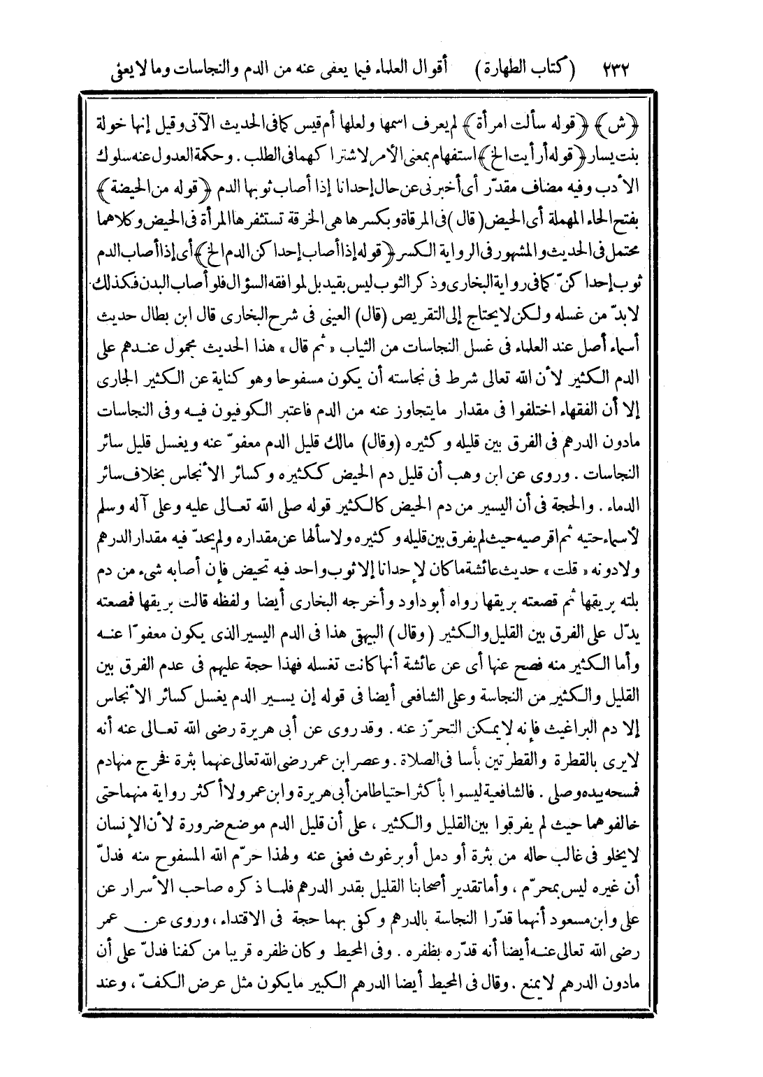 (قوله إذا أصاب إحداكن الدم الخ) أى إذا أصاب الدم ثوب إحداكنّ كما في رواية البخارى وذكر الثوب ليس بقيد بل لموافقه السؤال فلو أصاب البدن فكذلك لا بدّ من غسله ولكن لا يحتاج إلى التقريص (قال) العيني في شرح البخارى قال ابن بطال حديث أسماء أصل عند العلماء في غسل النجاسات من الثياب "ثم قال" هذا الحديث محمول عندهم على الدم الكثير لأن الله تعالى شرط في نجاسته أن يكون مسفوحا وهو كناية عن الكثير الجارى إلا أن الفقهاء اختلفوا في مقدار ما يتجاوز عنه من الدم فاعتبر الكوفيون فيه وفى النجاسات ما دون الدرهم في الفرق بين قليله وكثيره (وقال) مالك قليل الدم معفوّ عنه ويغسل قليل سائر النجاسات. وروى عن ابن وهب أن قليل دم الحيض ككثيره وكسائر الأنجاس بخلاف سائر الدماء. والحجة في أن اليسير من دم الحيض كالكثير قوله صلى الله تعالى عليه وعلى آله وسلم لأسماء حتيه ثم اقرصيه حيث لم يفرق بين قليله وكثيره ولا سألها عن مقداره ولم يحدّ فيه مقدار الدرهم ولا دونه "قلت" حديث عائشة ما كان لإحدانا إلا ثوب واحد فيه تحيض فإن أصابه شيء من دم بلته بريقها ثم قصعته بريقها رواه أبو داود وأخرجه البخارى أيضا ولفظه قالت بريقها فمصعته يدلّ على الفرق بين القليل والكثير (وقال) البيهقى هذا في الدم اليسير الذى يكون معفوا عنه وأما الكثير منه فصح عنها أى عن عائشة أنها كانت تغسله فهذا حجة عليهم في عدم الفرق بين القليل والكثير من النجاسة وعلى الشافعى أيضا في قوله إن يسير الدم يغسل كسائر الأنجاس إلا دم البراغيث فإنه لا يمكن التحرّر عنه. وقد روى عن أبى هريرة رَضِيَ اللَّهُ تَعَالَى عَنْهُ أنه لا يرى بالقطرة والقطرتين بأسا في الصلاة. وعصر ابن عمر رَضِيَ اللَّهُ تَعَالَى عَنْهُما بثرة فخرج منها دم فمسحه بيده وصلى. فالشافعية ليسوا بأكثر احتياطا من أبى هريرة وابن عمر ولا أكثر رواية منهما حتى خالفوهما حيث لم يفرقوا بين القليل والكثير، على أن قليل الدم موضع ضرورة لأن الإنسان لا يخلو في غالب حاله من بثرة أو دمل أو برغوث فعفى عنه ولهذا حرّم الله المسفوح منه فدلّ أن غيره ليس بمحرّم، وأما تقدير أصحابنا القليل بقدر الدرهم فلما ذكره صاحب الأسرار عن على وابن مسعود أنهما قدّرا النجاسة بالدرهم وكفى بهما حجة في الاقتداء، وروى عن عمر رَضِيَ اللَّهُ تَعَالَى عَنْهُ أيضا أنه قدّره بظفره. وفي المحيط وكان ظفره قريبا من كفنا فدلّ على أن ما دون الدرهم لا يمنع. وقال في المحيط أيضا الدرهم الكبير ما يكون مثل عرض الكفّ، وعند