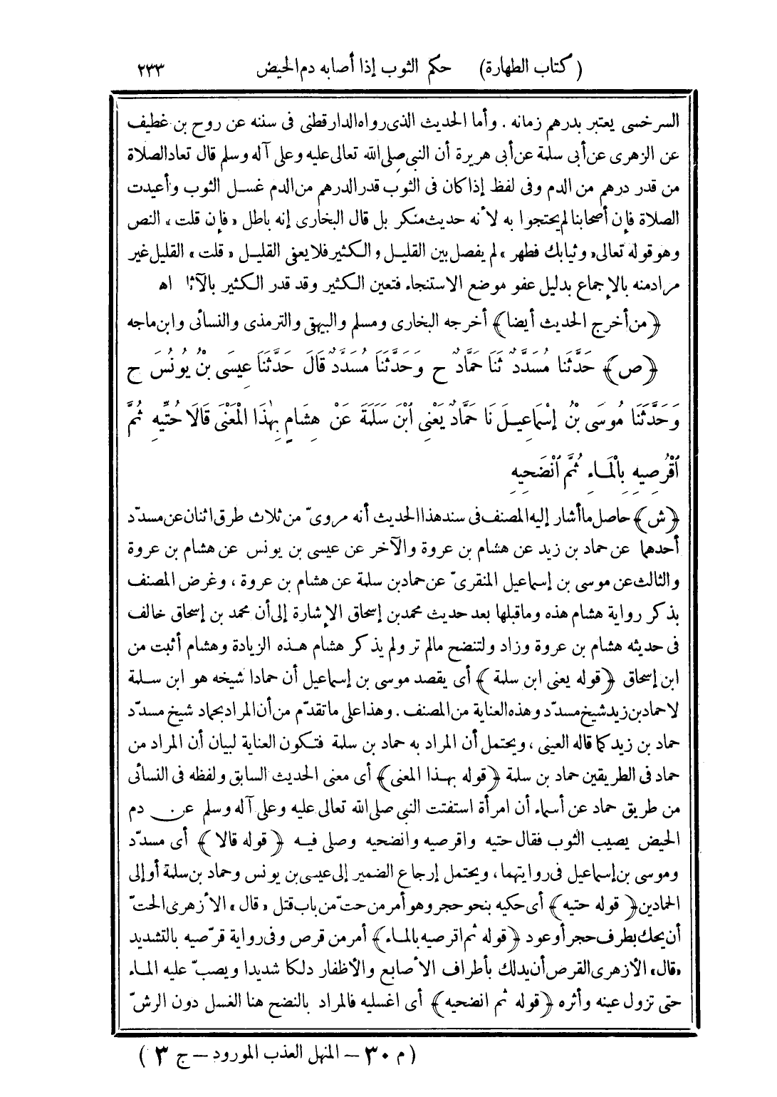 (ص) حَدَّثَنَا مُسَدَّدٌ، حَدَّثَنَا حَمَّادٌ، ح وحَدَّثَنَا مُسَدَّد، قَالَ حَدَّثَنَا عِيسَى بْنُ يُونُسَ، ح وحَدَّثَنَا مُوسَى بْنُ إِسْمَاعِيلَ، نَا حَمَّادٌ يَعْنِي ابْنَ سَلَمَةَ، عَنْ هِشَامٍ بِهَذَا الْمَعْنَى قَالَا: «حُتِّيهِ، ثُمَّ اقْرُصِيهِ بِالْمَاءِ، ثُمَّ انْضَحِيهِ»