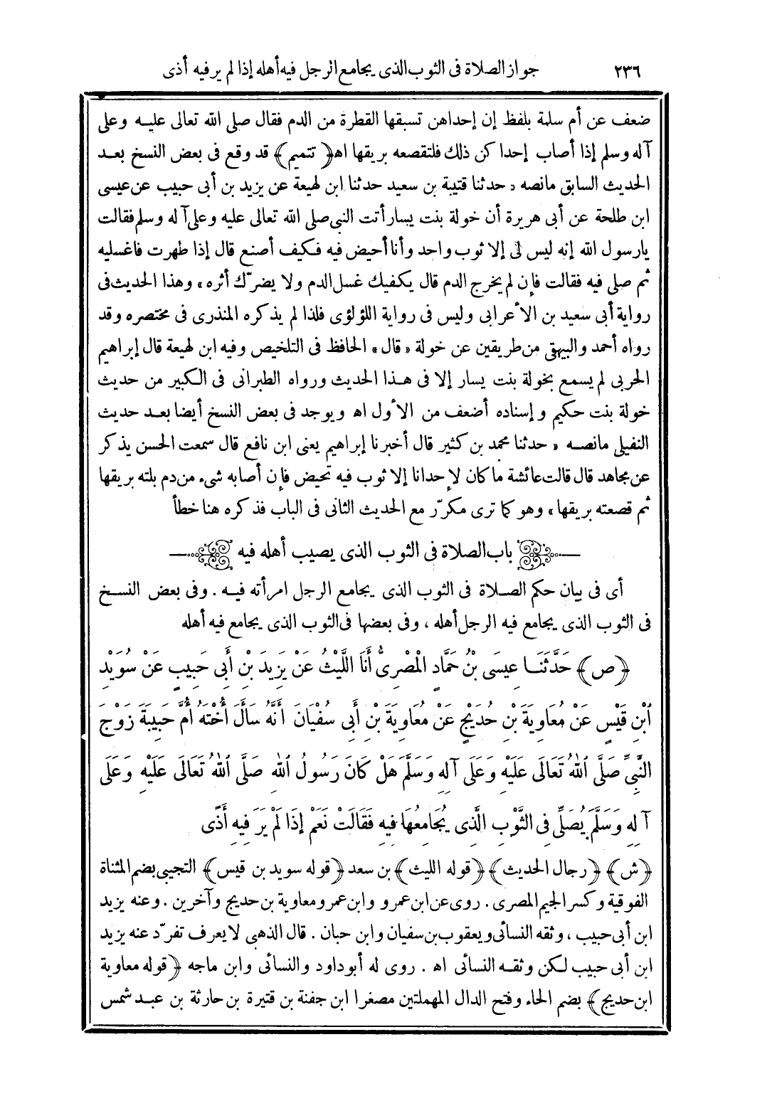 (ص) حَدَّثَنَا عِيسَى بْنُ حَمَّادٍ الْمِصْرِيُّ، أَنَا اللَّيْثُ، عَنْ يَزِيدَ بْنِ أَبِي حَبِيبٍ، عَنْ سُوَيْدِ بْنِ قَيْسٍ، عَنْ مُعَاوِيَةَ بْنِ حُدَيْجٍ، عَنْ مُعَاوِيَةَ بْنِ أَبِي سُفْيَانَ، أَنَّهُ سَأَلَ أُخْتَهُ أُمَّ حَبِيبَةَ زَوْجَ النَّبِيِّ صَلَّى اللهُ تَعَالَى عَلَيْهِ وَعَلَى آلِهِ وسَلَّمَ هَلْ كَانَ رَسُولُ اللَّهِ صَلَّى اللهُ تَعَالَى عَلَيْهِ وَسَلَّمَ يُصَلِّ فِي الثَّوْبِ الَّذِي يُجَامِعُهَا فِيهِ؟ فَقَالَتْ: «نَعَمْ إِذَا لَمْ يَرَ فِيهِ أَذًى».