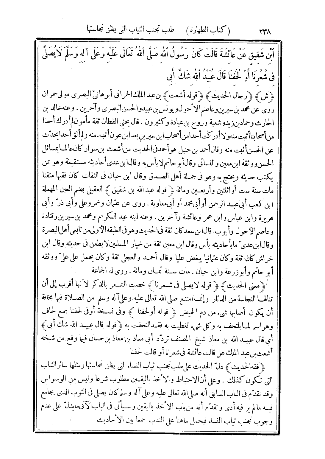 بْنِ شَقِيقٍ، عَنْ عَائِشَةَ قَالَتْ: «كَانَ رَسُولُ اللَّهِ صَلَّى اللهُ تَعَالَى عَلَيْهِ وَعَلَى آلِهِ وسَلَّمَ لَا يُصَلِّي فِي شُعُرِنَا، أَوْ فِي لُحُفِنَا» قَالَ عُبَيْدُ اللَّهِ: شَكَّ أَبِي.