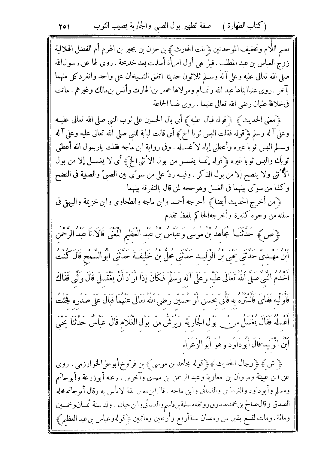 (ص) حَدَّثَنَا مُجَاهِدُ بْنُ مُوسَى، وَعَبَّاسُ بْنُ عَبْدِ الْعَظِيمِ الْمَعْنَى قَالَا: حَدَّثَنَا عَبْدُ الرَّحْمَنِ بْنُ مَهْدِيٍّ، حَدَّثَنِي يَحْيَى بْنُ الْوَلِيدِ، حَدَّثَنِي مُحِلُّ بْنُ خَلِيفَةَ، حَدَّثَنِي أَبُو السَّمْحِ قَالَ: كُنْتُ أَخْدُمُ النَّبِيَّ صَلَّى اللهُ تَعَالَى عَلَيْهِ وَعَلَى آلِهِ وسَلَّمَ، فَكَانَ إِذَا أَرَادَ أَنْ يَغْتَسِلَ قَالَ: «وَلِّنِي قَفَاكَ». فَأُوَلِّيهِ قَفَايَ فَأَسْتُرُهُ بِهِ، فَأُتِيَ بِحَسَنٍ، أَوْ حُسَيْنٍ رَضِيَ اللَّهُ تَعَالَى عَنْهُ مَا فَبَالَ عَلَى صَدْرِهِ فَجِئْتُ أَغْسِلُهُ فَقَالَ: «يُغْسَلُ مِنْ بَوْلِ الْجَارِيَةِ، وَيُرَشُّ مِنْ بَوْلِ الْغُلَامِ» قَالَ عَبَّاسٌ: حَدَّثَنَا يَحْيَى بْنُ الْوَلِيدِ قَالَ أَبُو دَاوُدَ: وَهُوَ أَبُو الزَّعْرَاءِ