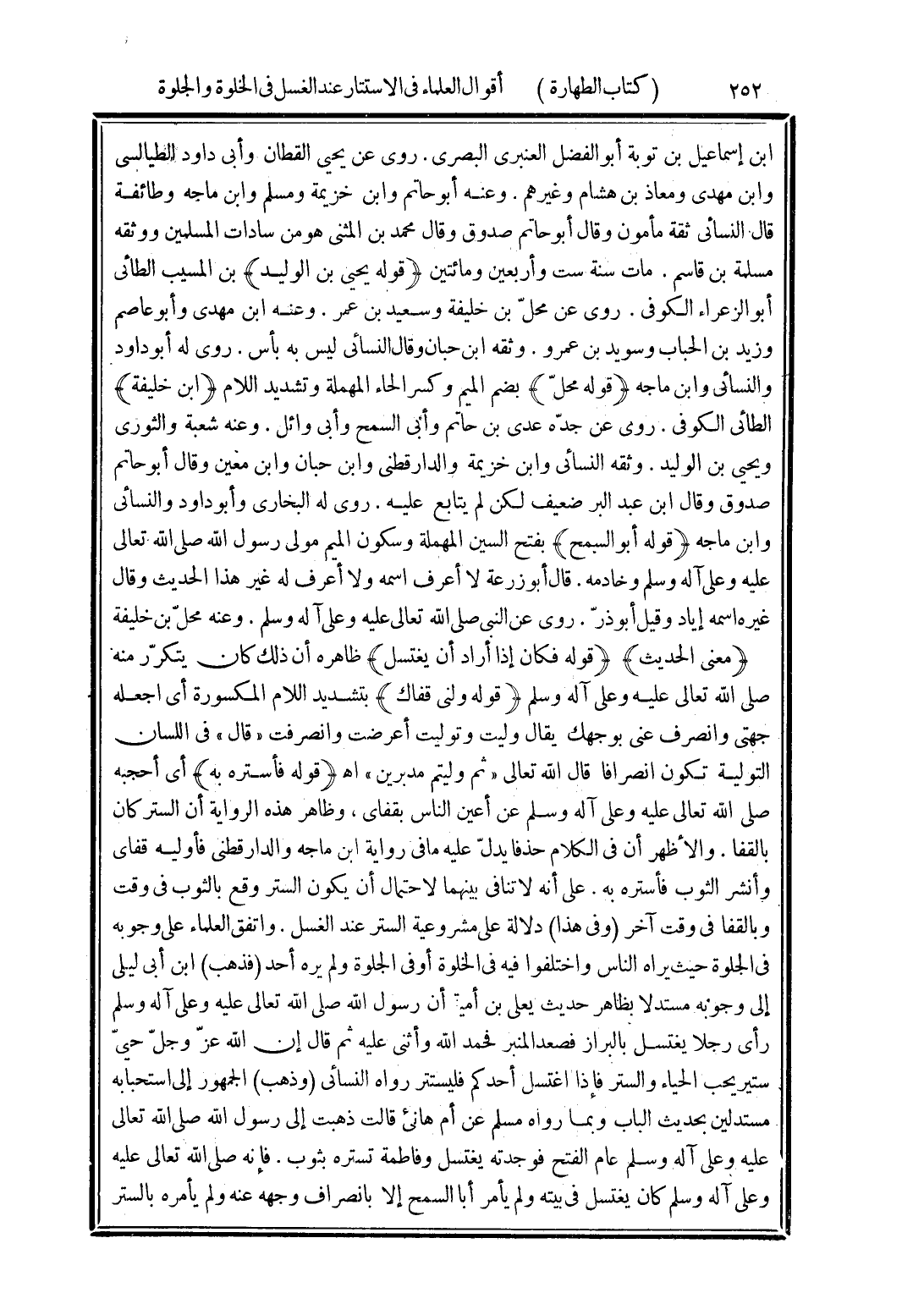 (قوله فأستره به) أى أحجبه صلى الله تعالى عليه وعلى آله وسلم عن أعين الناس بقفاى، وظاهر هذه الرواية أن الستر كان بالقفا. والأظهر أن في الكلام حذفا يدلّ عليه ما في رواية ابن ماجه والدارقطنى فأوليه قفاى وأنشر الثوب فأستره به. على أنه لا تنافى بينهما لاحتمال أن يكون الستر وقع بالثوب في وقت وبالقفا في وقت آخر (وفى هذا) دلالة على مشروعية الستر عند الغسل. واتفق العلماء على وجوبه في الجلوة حيث يراه الناس واختلفوا فيه في الخلوة أو في الجلوة ولم يره أحد (فذهب) ابن أبى ليلى إلى وجوبه مستدلا بظاهر حديث يعلى بن أمية أن رسول الله صلى الله تعالى عليه وعلى آله وسلم رأى رجلا يغتسل بالبراز فصعد المنبر فحمد الله وأثنى عليه ثم قال إن الله عزّ وجلّ حييّ ستير يحب الحياء والستر فإذا اغتسل أحدكم فليستتر رواه النسائي (وذهب) الجمهور إلى استحبابه مستدلين بحديث الباب وبما رواه مسلم عن أم هانئ قالت ذهبت إلى رسول الله صلى الله تعالى عليه وعلى آله وسلم عام الفتح فوجدته يغتسل وفاطمة تستره بثوب. فإنه صلى الله تعالى عليه وعلى آله وسلم كان يغتسل في بيته ولم يأمر أبا السمح إلا بانصراف وجهه عنه ولم يأمره بالستر